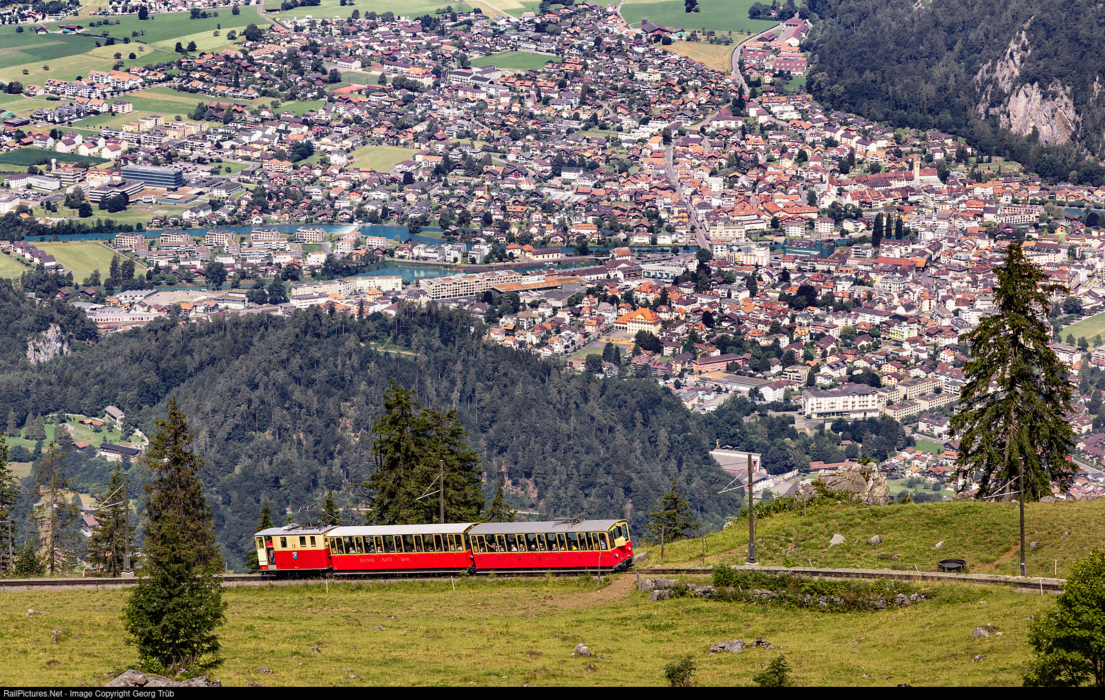 | Train 651 of the Schynige Plate-Bahn with departure at 10.45 AM in Wilderswil was run in three section due to high demand. Cogwheel locomotive He 2/2 # 19 "Flühblume" is on the way above Breitlauenen with the second section. In the valley, about 1000 meter deeper, are Interlaken and Unterseen. The Interlaken West train station is about in the middle. The Aare river can be seen connecting Brienzer- and Thunersee. |
