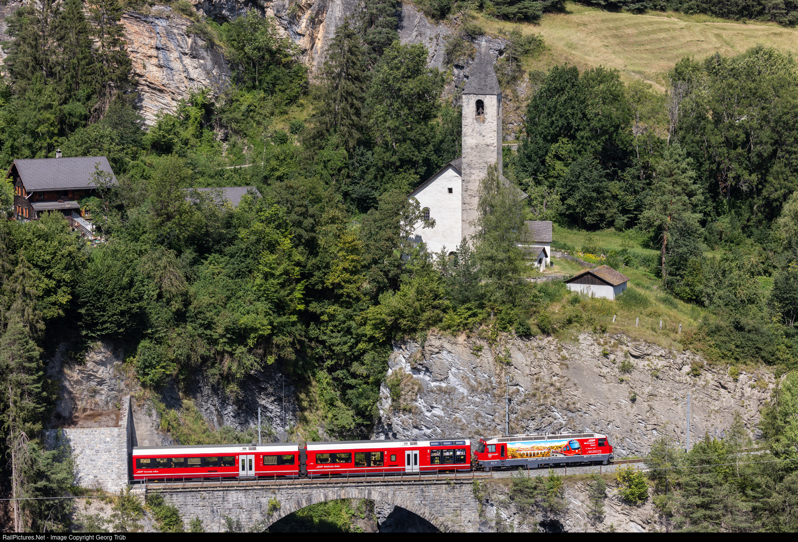 | IR 1149 of the line IR38 of the Rhaetian Railway from Chur over the Albula line to St.Moritz, is leaving the 300 meter long Mistail tunnel and crossing the 38 meter long Mistailtobel viaduct in the Schin gorge, with Ge 4/4 III # 644 in the publicity paint scheme for the world's longest narrow gauge passenger train on october 29th, 2022. Above the rock face is the carolingian three apsis church of St.Peter Mistail in Alvaschein from the 9th century. |