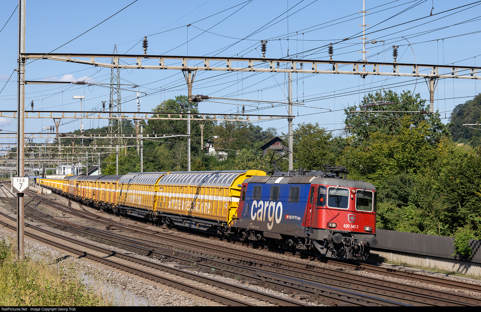 | Re 420 # 347 (Re 4/4 II # 11347) of the SBB pulls the very long letter mail train 50018 from Zürich Mülligen to Geneva Voie-Creuse through Otmarsingen, with stops in the Härkingen and Daillens sort centers. |