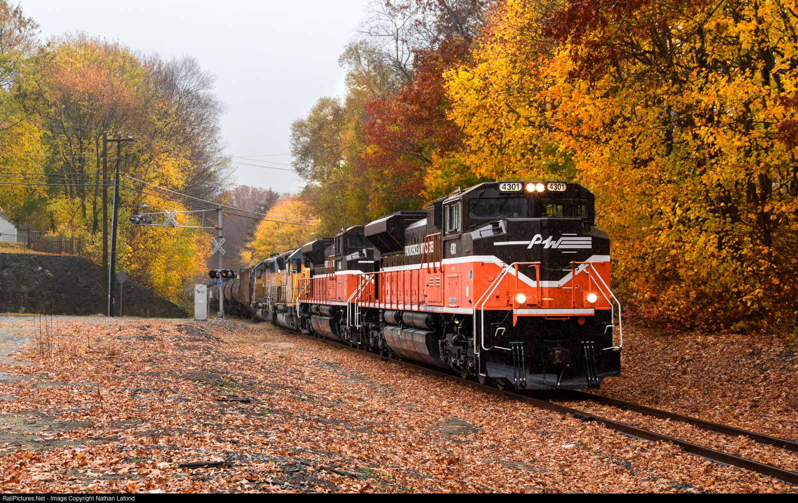 The famous pair of Providence and Worcester SD70M-2's, and two NECR SD40's, bring a loaded unit ethanol train into "Gluck" Yard Limits in Plainfield, Connecticut. Heavy rain and an insane amount of fallen leaves proved to be quite the challenge for the four 6 axle locomotives, as they struggled to keep track speed the entire trip down the Willimantic Branch.