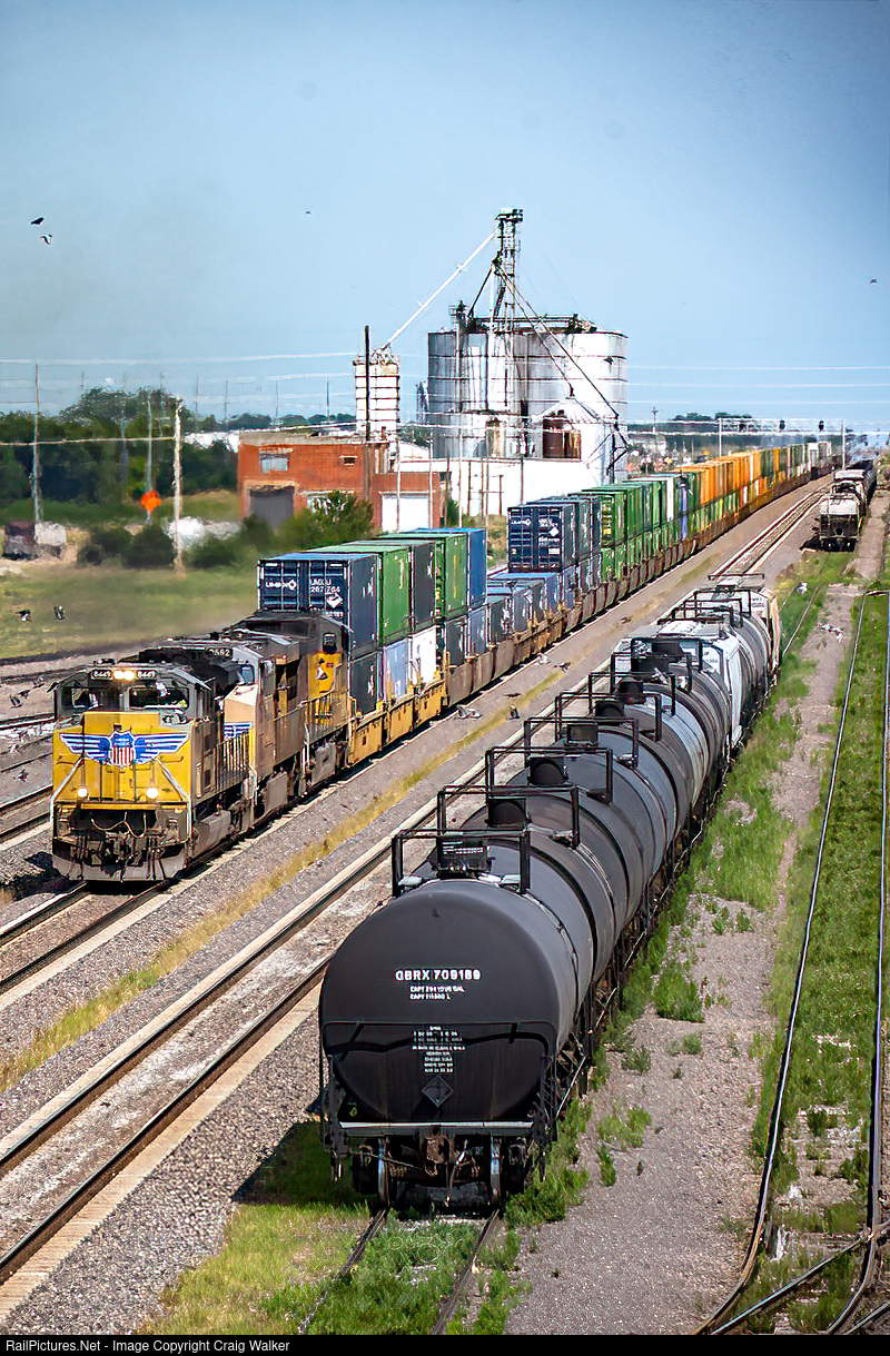 As Union Pacific UPS Expedited Intermodal train ZG2SC-15 (Proviso IL’s Global 2 to Salt Lake City UT) speeds west on the Kearney Sub, it disturbs a group of pigeons feeding on some grain spilled along the right of way. UP SD70ACe 8449, ES44CW 2562 and AC4400CW 7202 are powering this train. (Lexington, Nebraska – July 16, 2024)