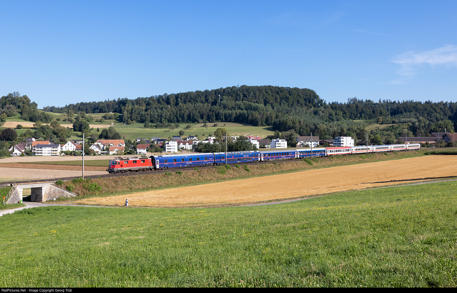 | During a 3-week closure of the Rhine Valley main line in Rastatt/Germany, freight trains and night trains will have to be diverted via other routes. SBB's Re 420 # 192 (Re 4/4 II # 11192) pulls the NightJet 471 from Hamburg main station via Bremen-Verder-Hannover-Göttingen-Singen (Hohentwiel)-Schaffhausen to Zurich, between Lottstetten and Rafz. |
