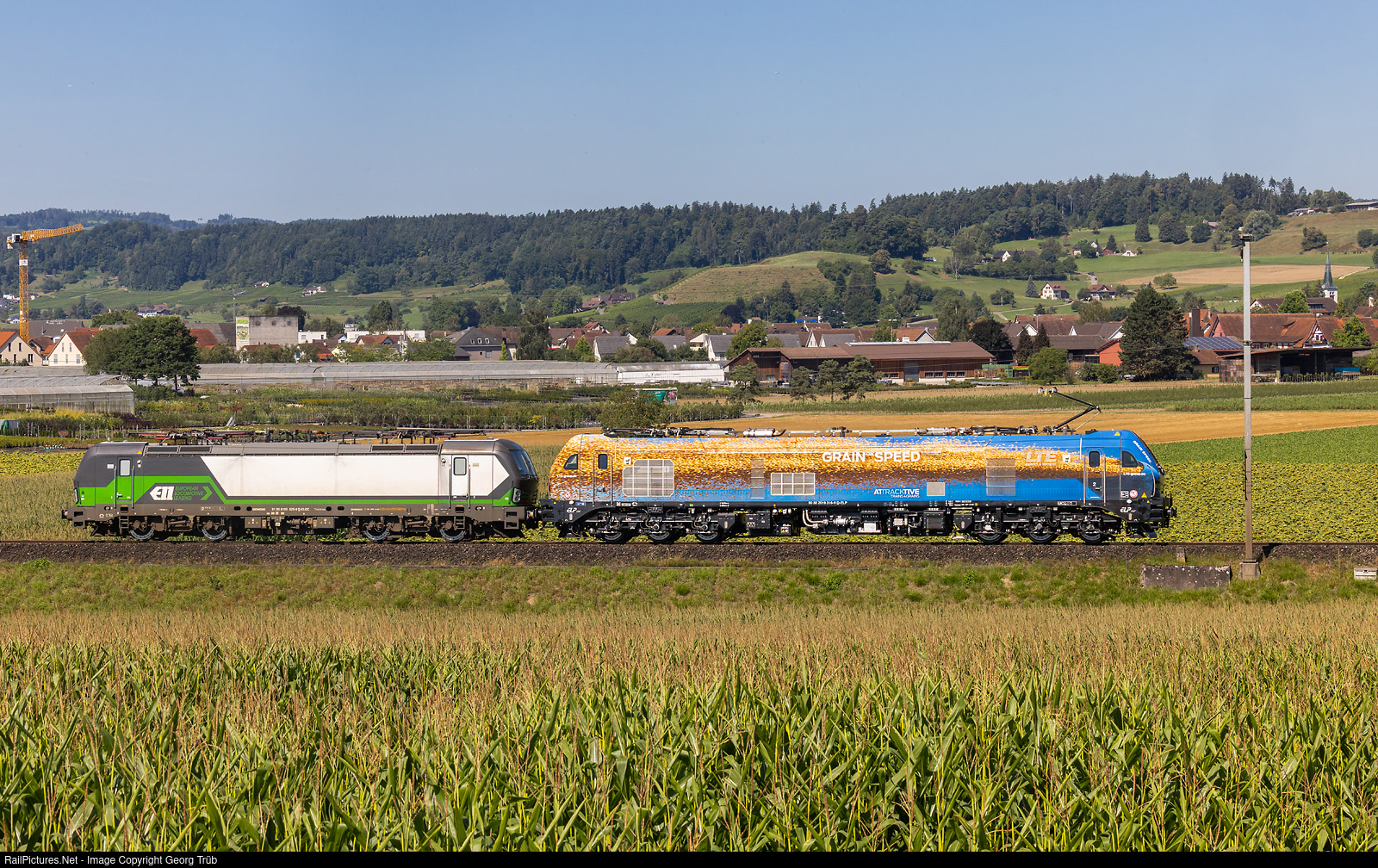 Euro9000 multisystem locomotive 2019 # 316 of the LTE (Logistic and Transport Gmbh), rented from the ELP (European Loc Pool) and built by StadlerRail, Valencia/Spain, in the "Grain Speed" paint scheme, pulls the Siemens "Vectron" 193 # 829 of the ELL (European Locomotive Leasing), rented from LTE, as train 99436 from Rheinfelden via Koblenz-Eglisau-Schaffhausen-Singen-Radolfzell-Friedrichshafen-Lindau-Memmingen to Munich, between Rafz and Lottstetten. The Euro9000 has up to 9000 kW electric power and 1900 kW from two diesel motors.