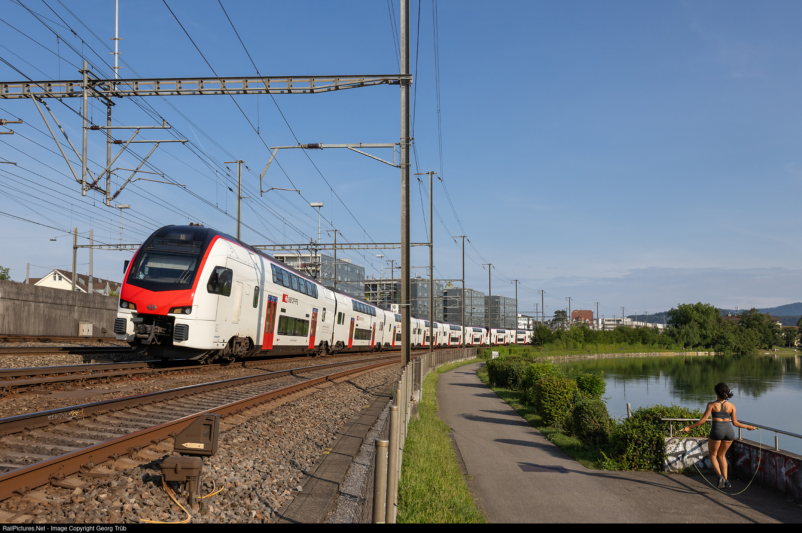| Two "IRD" (Interregio doubledeck train) RABe 512 of the SBB in multiple control are leaving Dietikon, running as IR 2016 of the line IR36 from Basel via Frick-Brugg-Baden-Zürich main station to Zürich Airport. |