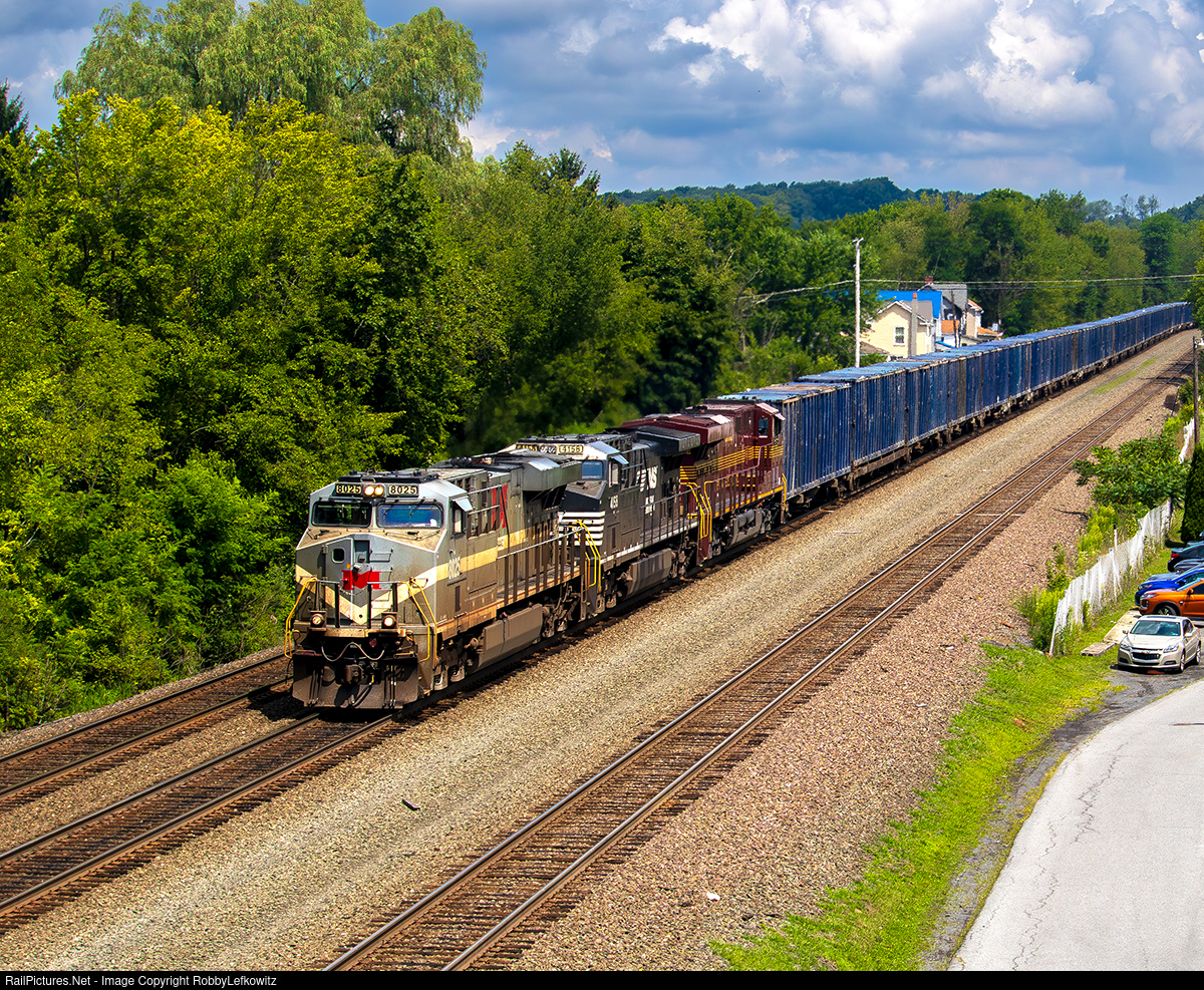 NS 8025, the Monongahela Heritage Unit, and NS 8102, the Pennsylvania Railroad Heritage Unit, lead westbound loaded trash train NS 63V through Lilly, Pennsylvania.