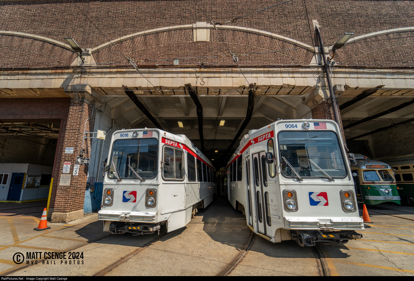 K Car Barn. Southeastern Pennsylvania Transportation Authority (SEPTA) Type K cars 9016 and 9064 (Kawasaki , 1980-1981) are seen resting in bay 3 at the Callowhill Depot, waiting for their next runs on Route 10.