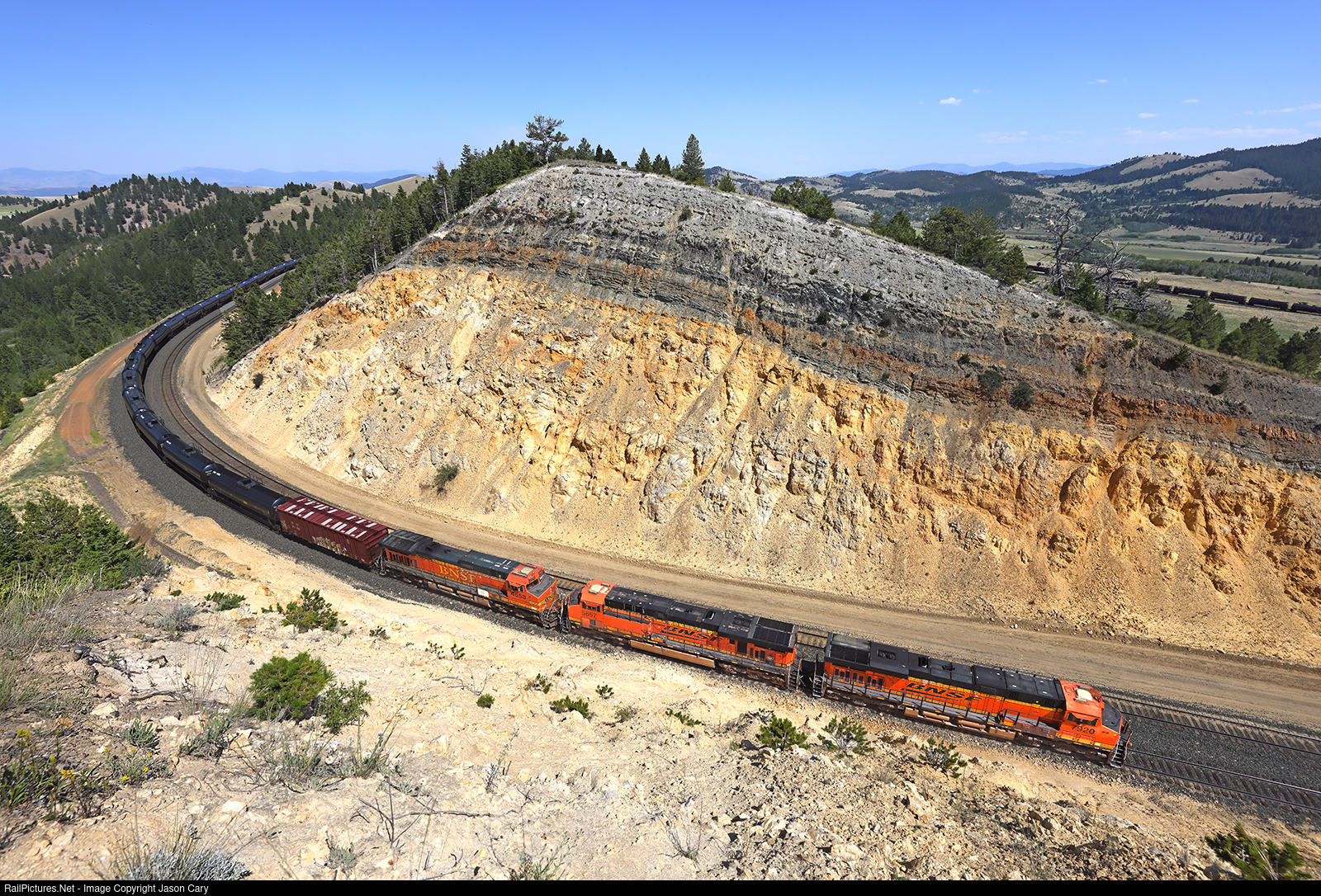 A BNSF oil train rounds the 10 degree curve and climbs the 2.2% grade at Iron ridge on Mullan Pass. The train is bound for Pacific Coast refineries and acts as a pipeline as there is little, to no, pipeline capacity from North Dakota to the Pacific Northwest. The coastal refineries were historically served by Alaska and International Crude oil. The new shale deposits have changed the transport of crude oil dramatically in many locations. The rainbow of minerals in the rock inside the cut is what built Montana. Gold and Copper from rock like this was mined and sent to local smelters. The ore then forged gold bullion and built the modern copper infrastructure we have today.