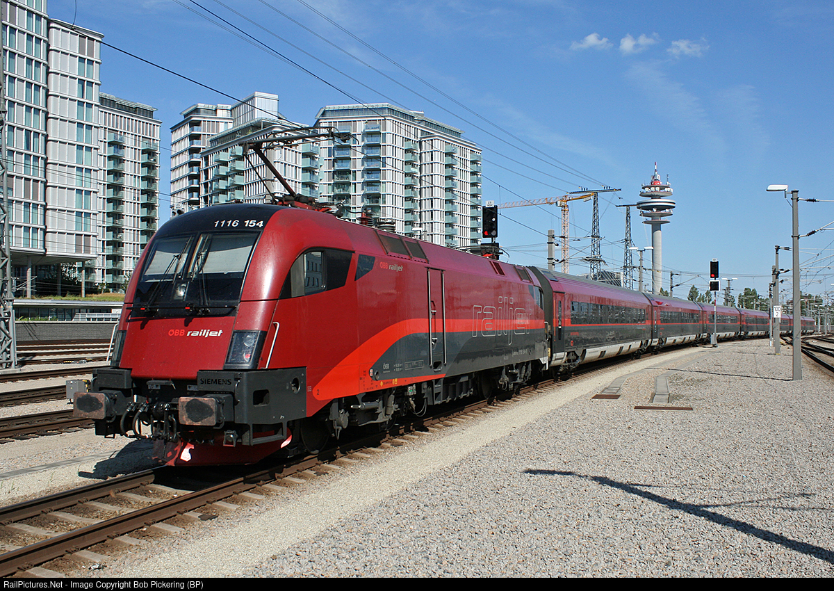 | A Railjet pushes off from Wien HBF with a Siemens Taurus shoving. The A1 tower in the distance is a local landmark. If you google Arsenal A1 tower you can find a webcam view of the rail yard. |