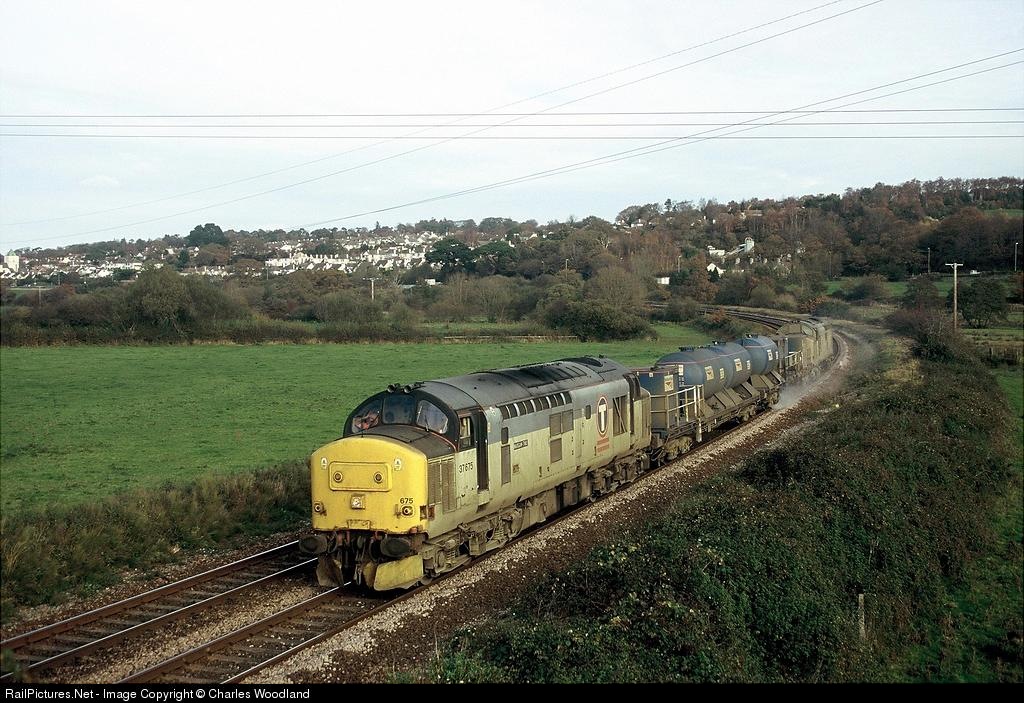 | During the autumn, EWS operates a number of "Water Cannon" trains on behalf of Network Rail. The train blasts the rails to remove leaves and other debris. Class 37s 37675/37698 are seen working 0955 Barton Hill-Truro at the start of the climb to Dainton |
