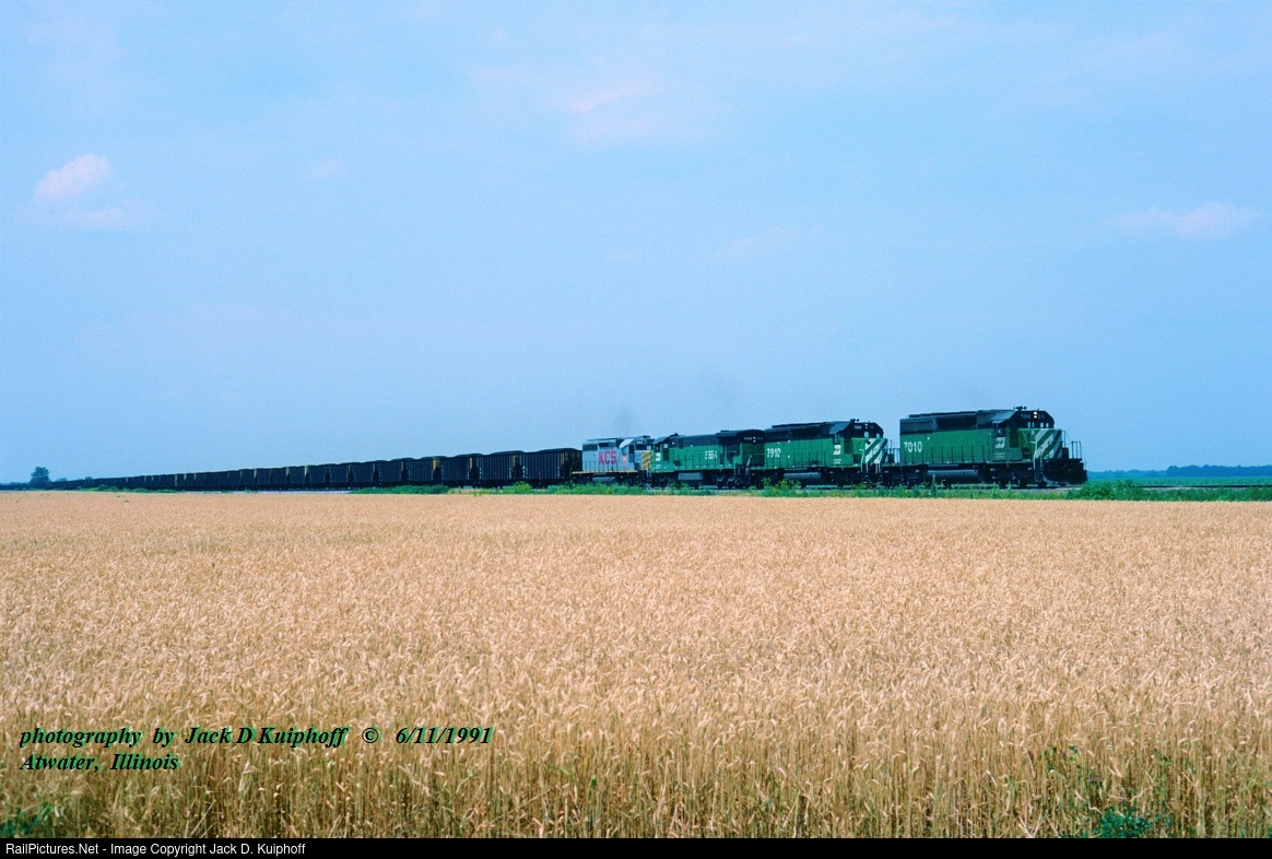 | Burlington Northern, BN 7010 - 7910 - 5554 -KCS 862, with a coal train Atwater, Illinois. June 11, 1991. Jack D Kuiphoff © photo |