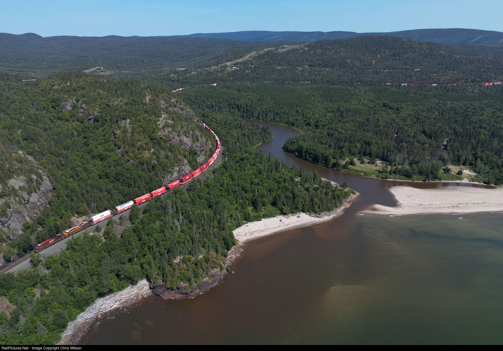 CP ES44AC 8911 + KCS ES44AC 4685 descend into Middleton with priority intermodal traffic. The Little Pic River empties into Lake Superior to the right on an ever changing path.