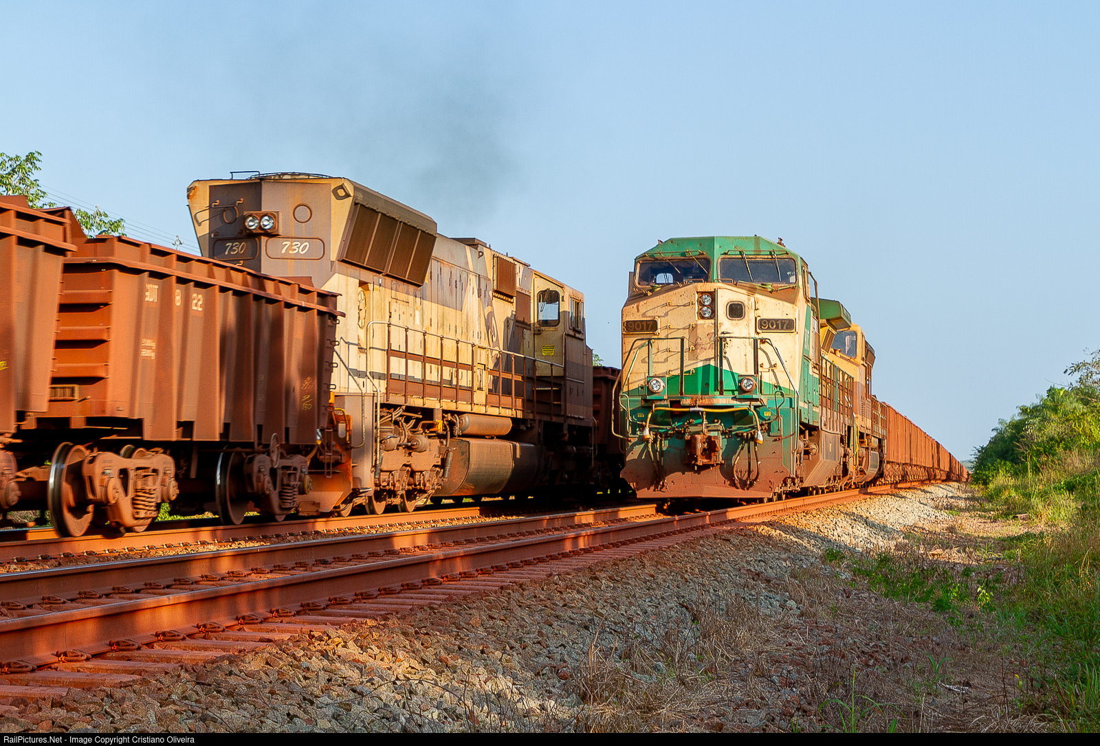 | Under a nice late afternoon light, loaded iron ore train led by a former Ferronorte unit still wearing it's beautiful original paint scheme, waits conditions to proceed while an empty train flyies by over the main two bound to the mines for another load. |