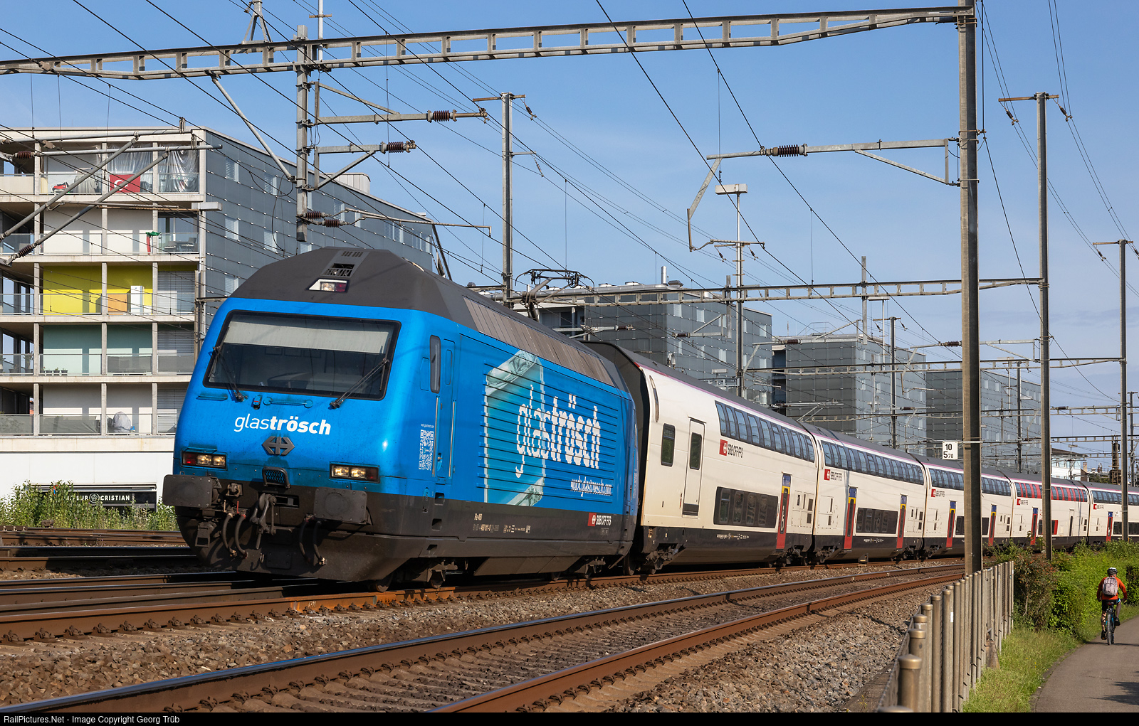 | Re 460 # 011 of the SBB in the blue "Glas Trösch" publicity paint scheme pulls the "IC2000" push-pull train IC 809 of the line IC81 from interlaken Ost via Bern-Zürich to Romanshorn, through Dietikon. |