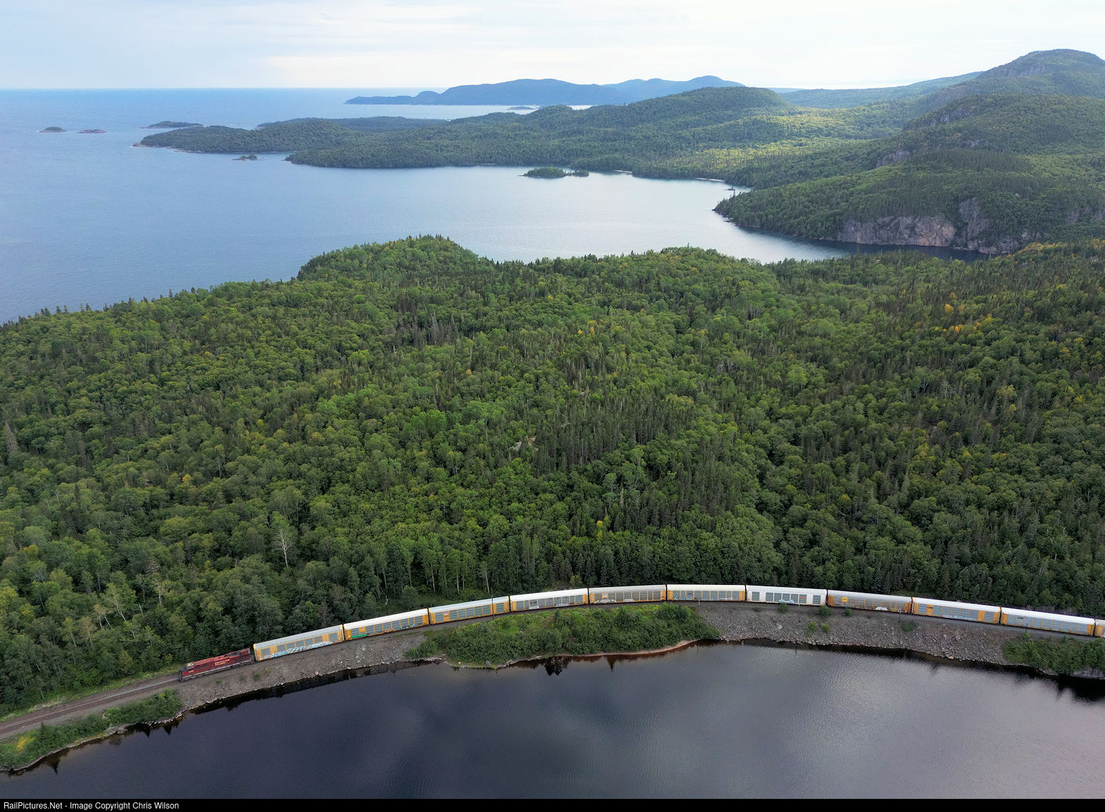 CP ES44AC 8881 heads up 104's train eastbound out of Coldwell along the shores of Echo Lake along Lake Superior