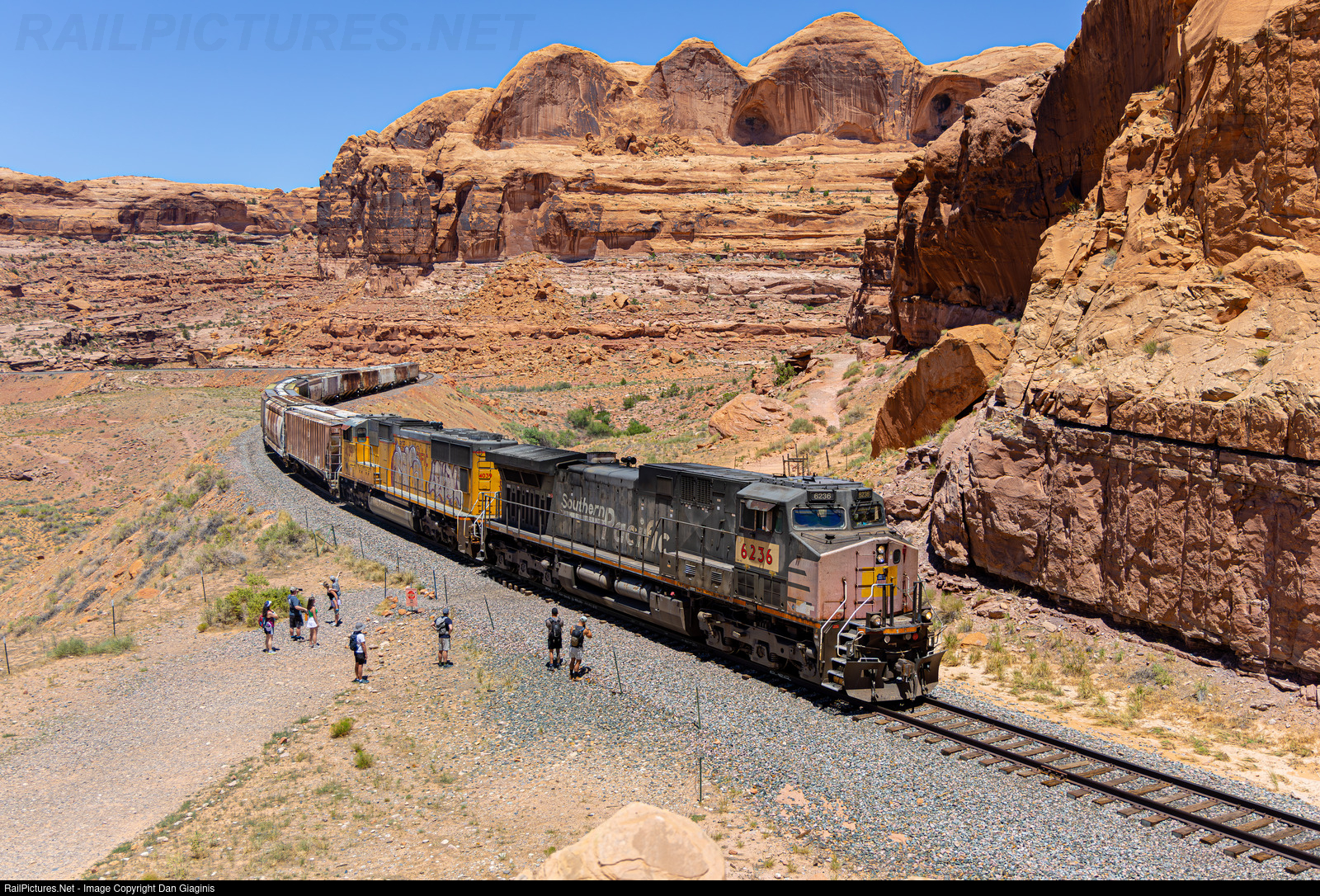 | They'll Find a Way: One of only a handful of SP-patched AC44s that UP still has on their active roster, UP 6236 leads the famed UP LDG51B potash local as they ascend the grade out of Moab and into the Bootleggers Canyon on a scorching July afternoon. |