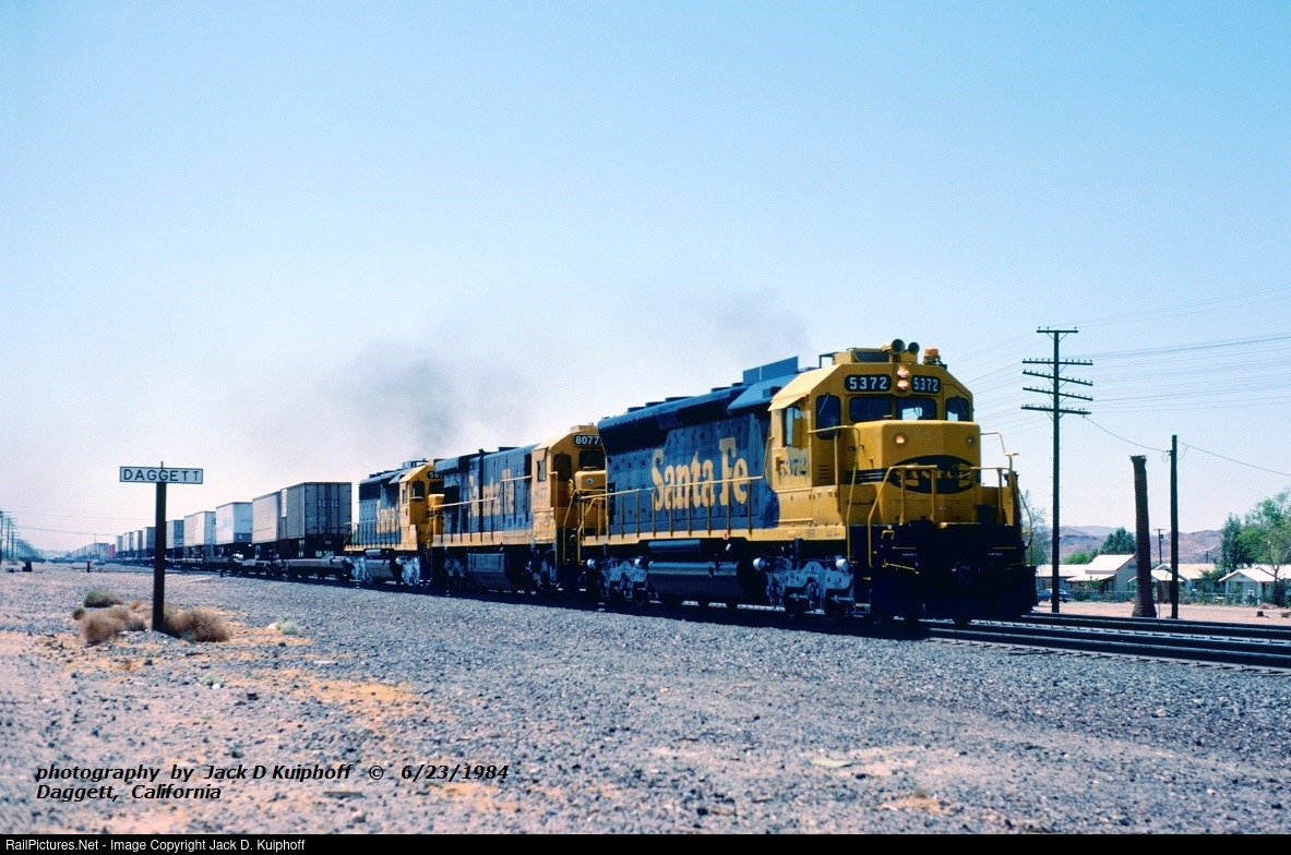 | Santa Fe, AT&SF 5372 -8077 -5673, eastbound at, Daggett, California. June 23, 1984. Jack D Kuiphoff © photo |