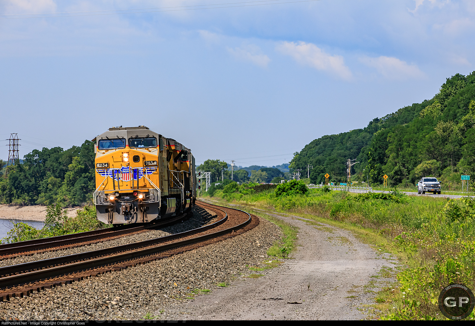 | B779 with UP 7034 & an UP ACe pulling along, oil number 2 for the day, rolls along State Route 5 & the Mohawk River at Erie Canal Lock 10 with CP-173 seen in the distance and a Chevy Silverado following parallel. |