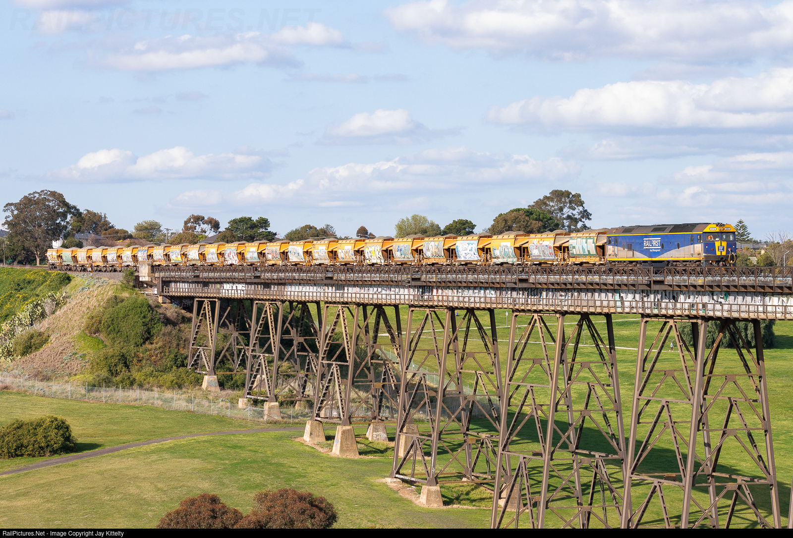 Railfirst Asset Management's G512 is seen leading Qube Logistics' Hanson Quarry train from Kilmore East to Brooklyn. The train is seen crossing the Gowanbrae Viaduct.