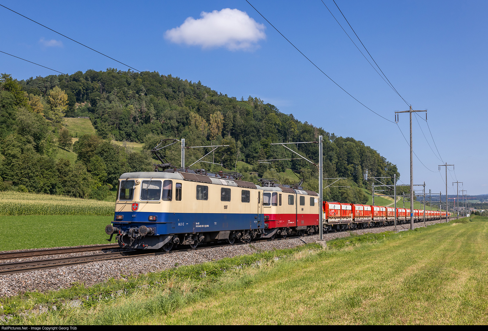 | Re 421 # 387 (Re 4/4 II # 11387) in the RHEINGOLD paint scheme and Re 421 # 393 (Re 4/4 II # 11393) in the TRANS EUROP EXPRESS paint scheme of the International Rolling Stock Investment AG (IRSI) in multiple control pull the empty excavation train 67831 from Hüntwangen-Wil via Bülach-Regensdorf-RBL-Zürich Altstetten-Thalwil to Sihlbrugg, between Eglisau and Glattfelden. |