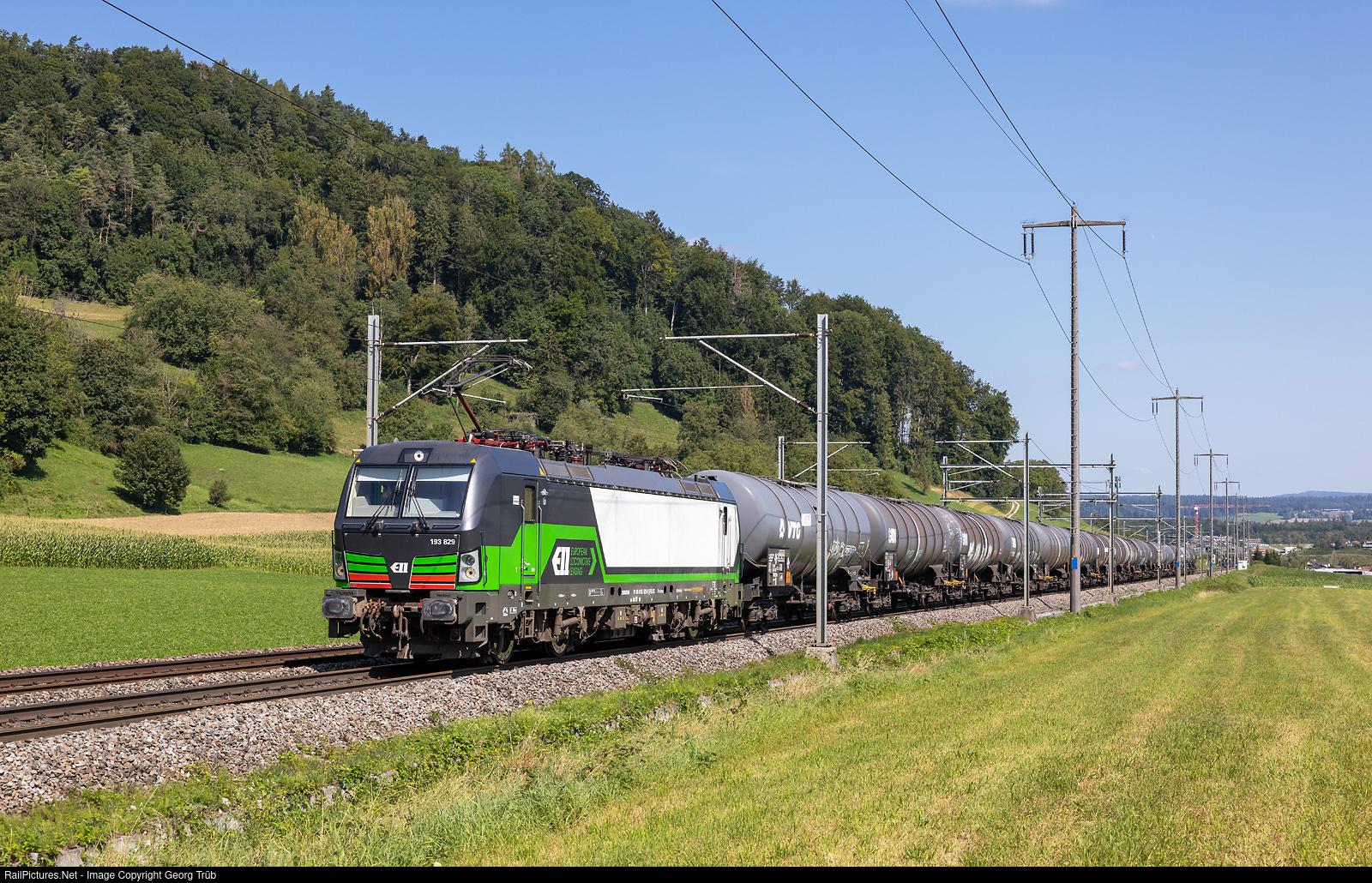 | Siemens "Vectron" 193 # 829 of the LTE (Logistik and Transport Gmbh) pulls the loaded gasoline train 44661 from (Grosskorbetha-) Singen (Hohentwiel) via Schaffhausen-Bülach-Winterthur to Wil freight yard (-Bettwiesen fuel depot), between Eglisau and Glattfelden. |