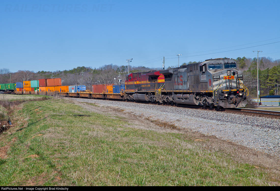 | Not to many grey KCS motors left. An un-rebuilt AC4400CW in as delivered paint, rolls through rural Alabama with a train of mainly Mexican intermodal bound for Atlanta and beyond. |