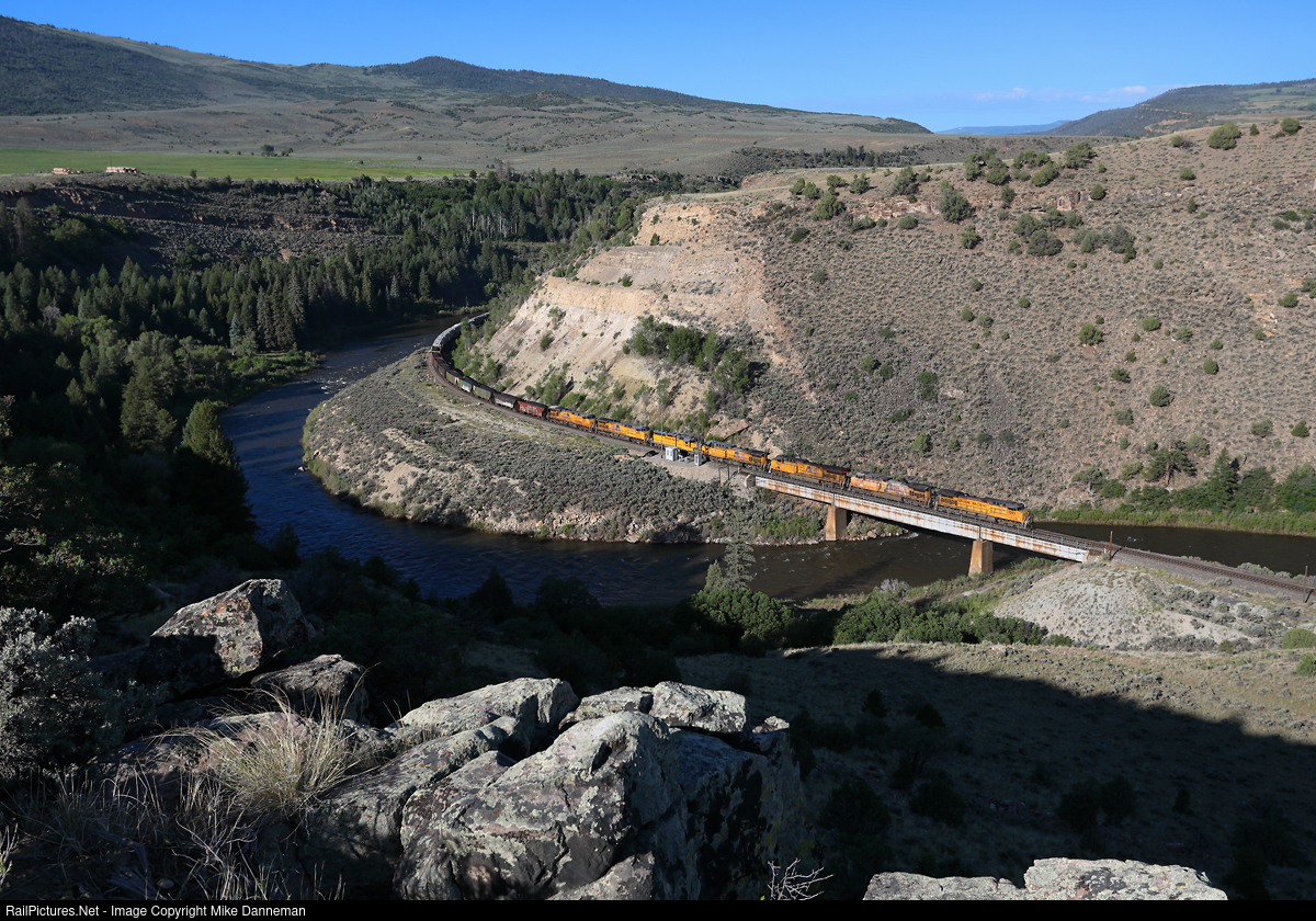 Union Pacific’s freight operating between Grand Junction and Denver (MGJNY), crosses the Colorado River just east of Burns, Colorado, on the morning of June 26, 2024. This location on the Dotsero Cutoff is between the sidings of Range and Dell on the railroad”s Glenwood Springs Subdivision.