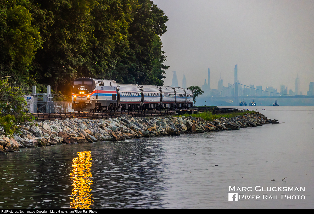 Dobbs Ferry Forty Years Later. On Thursday, August 15, 2024, Amtrak's 40th Anniversary Phase II unit, P42DC AMTK 130, makes a rare appearance on the Hudson Line at dusk, leading Train 241. While the Hudson Line assignments are normally held down by dual-mode P32s, when one is not available, a P42 will substitute and the "vents" in Penn Station will be turned on to remove the exhaust. Phase II was a short lived Amtrak paint scheme, lasting from about 1974-1976, during which time the Genesis predecessor F40s and FL-9s wore these colors. The train is seen turning the curve at Half Moon, with the New York City skyline in the background.