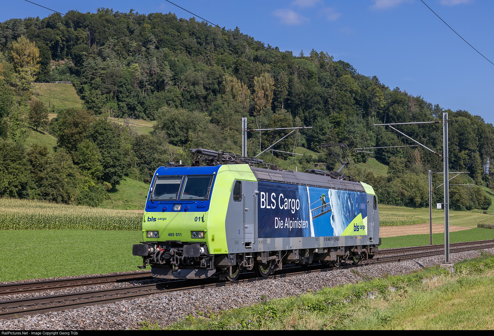 | Bombardier TRAXX F140 AC1 Re 485 # 011 of the BLS Cargo is running light as train 99420 from Singen (Hohentwiel) via Schaffhausen to Bülach, between Eglisau and Glattfelden. |