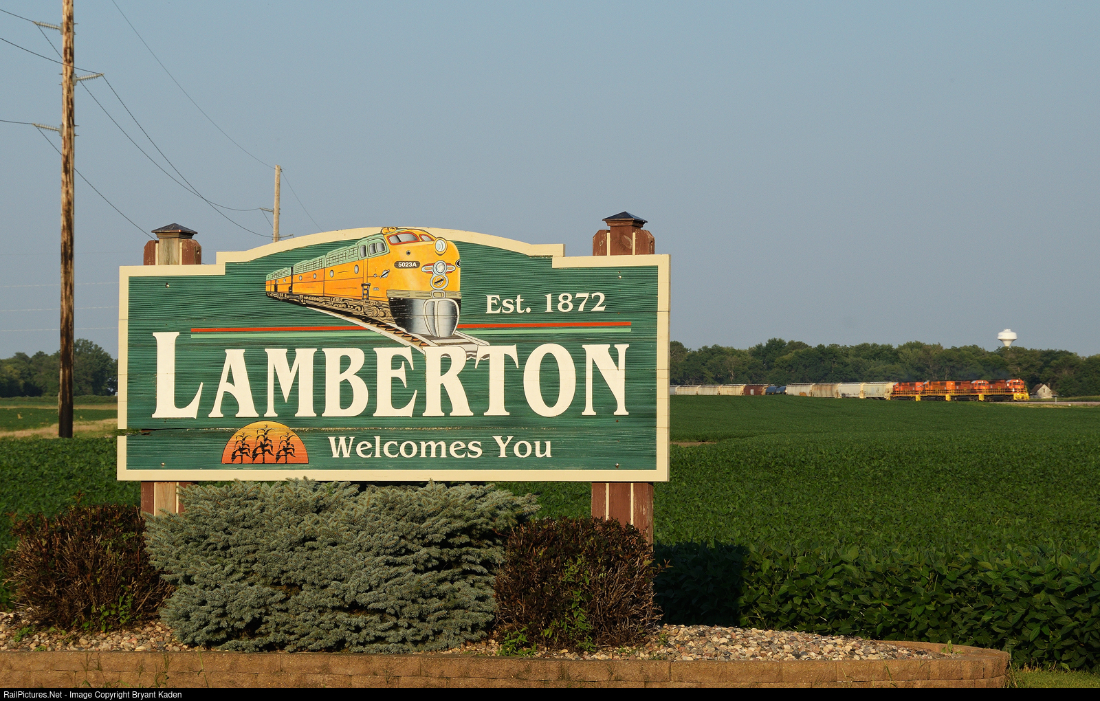 A large sign featuring the town's railroad heritage welcomes travelers on US Highway 14 to Lamberton, MN while in the distance a westbound Rapid City, Pierre & Eastern train utilizes the former Chicago & North Western tracks through town. I've always wanted to try to get this kind of shot here, but it takes a westbound train on a summer evening when the sun is on the north side of the tracks, not to mention the field in the foreground being planted with soybeans rather than corn.