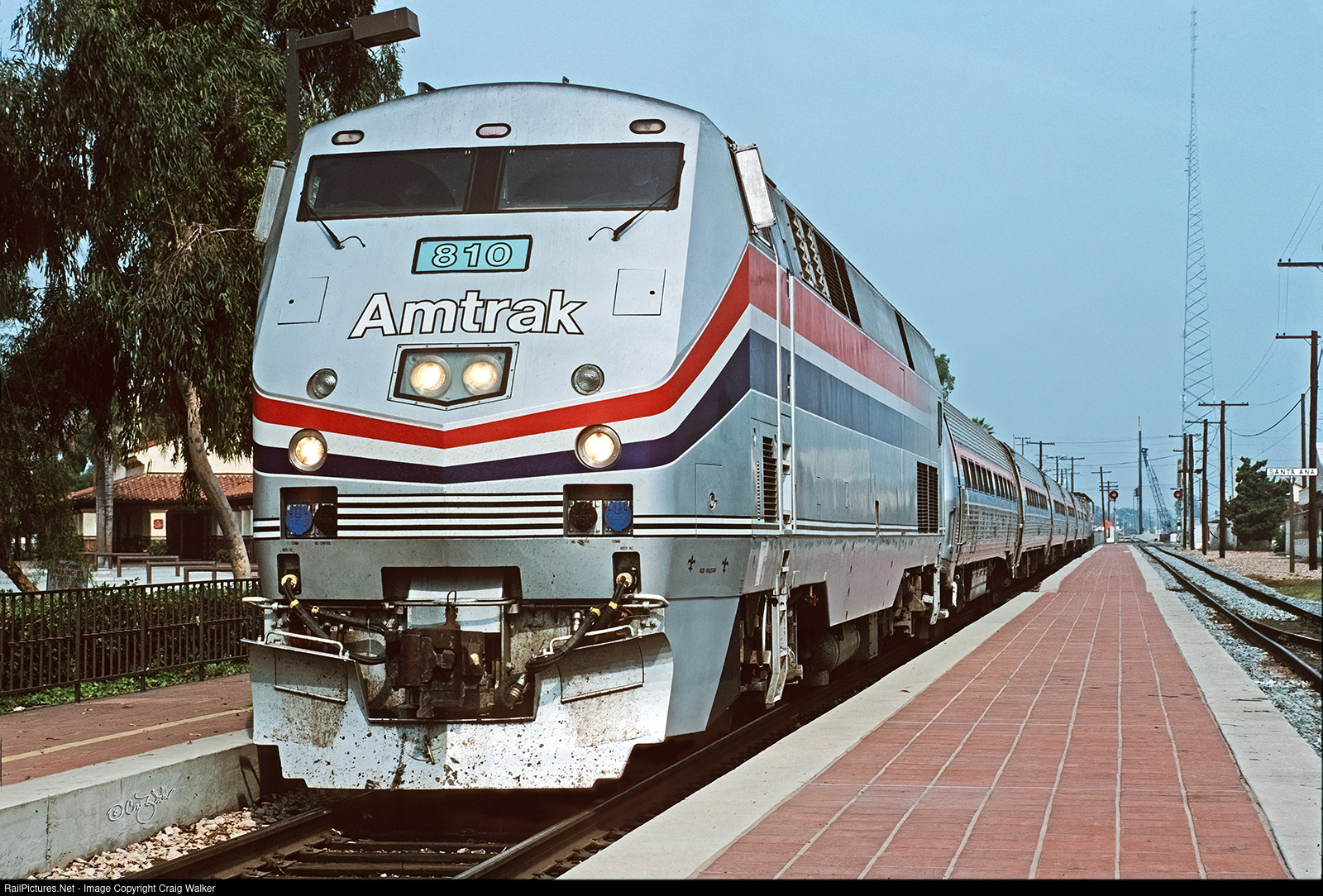 Heading to San Diego from Goleta, Amtrak San Diegan 774 makes its stop in Santa Ana. Five-month-old Dash 8-40BP 810 leads this train this day, pulling six Amfleet cars, a baggage car and F40PH 293. Apparently, the carrier was not yet 100% confident in these new GE diesels, hence the F40PH on the other end. The station has not yet had the pedestrian walkway added, nor the platform on the east side of the mainlines. (Santa Ana, California – November 1993)