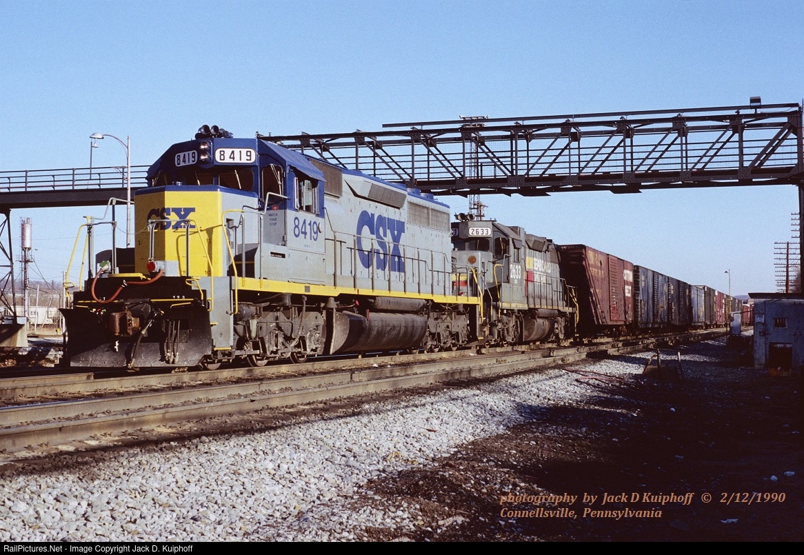 | CSX SD40 8419 (ex-C&O)- SBD GP38-2 2633-(ex-SBD #4126, ex-L&N 4126), about to leave with a fresh crew with the R396 eastbound on the Keystone sub at the overhead, Connellsville, Pennsylvania. February 12, 1990. Jack D Kuiphoff © photo |