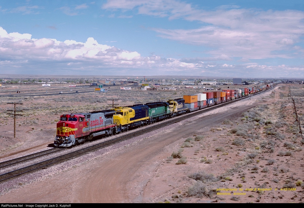 | Santa Fe, ATSF 523-5957-6348-5067 is westbound leaving Winslow, Arizona. April 12, 1998. Jack D Kuiphoff © photo |