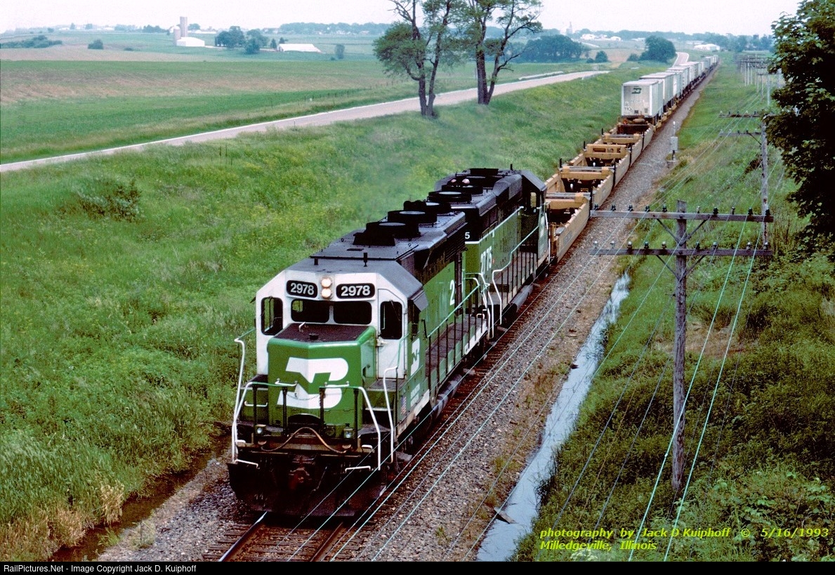 | Burlington Northern, BN GP39V 2978 -GP39E 2775, with a westbound TOFC at, Milledgeville, Illinois. June 16, 1993. Jack D Kuiphoff © photo --------------