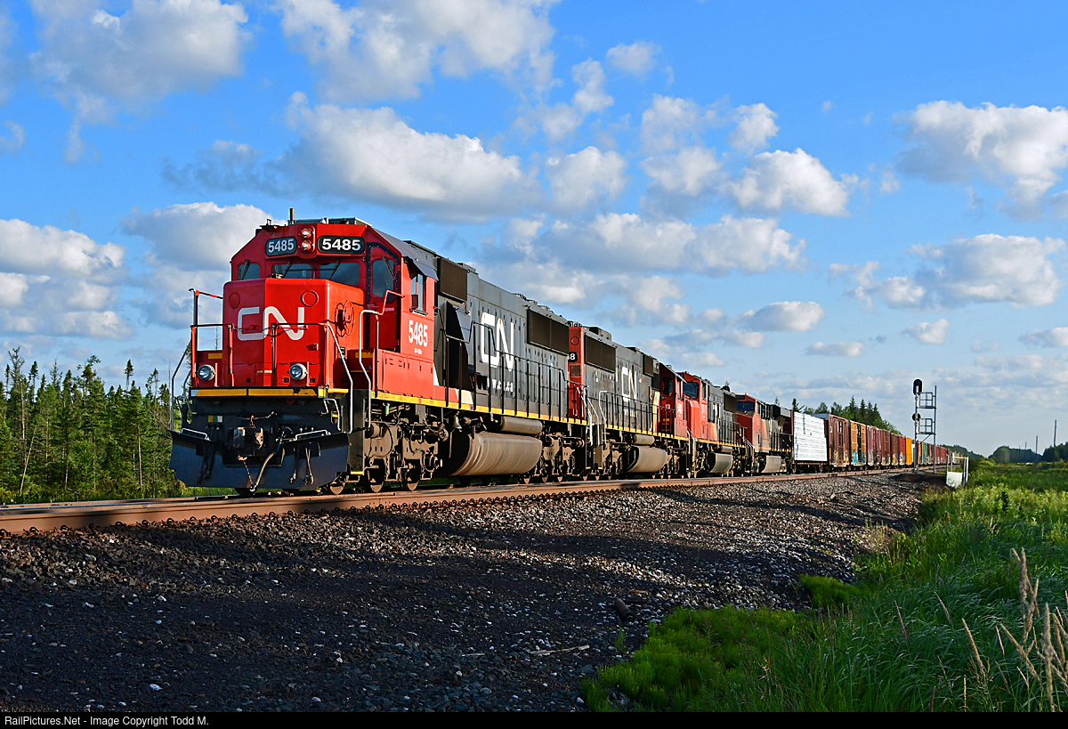 | After a meet with a northbound, CN 5485 is back on the move south for Proctor yard with freight from Ranier, MN. |