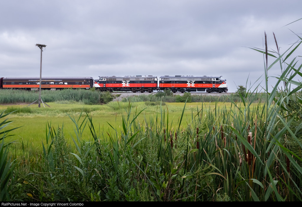 | For the first time in revenue service, Mass Coastal FL9s 2011 and 2026 were coupled together and ran excursions for Cape Cod Central's Railfan Day. At Bridge Creek in West Barnstable, the train is seen heading north from Hyannis to Bourne. The structure on the left supports the nest of an Osprey, which flew away once the train went by. |