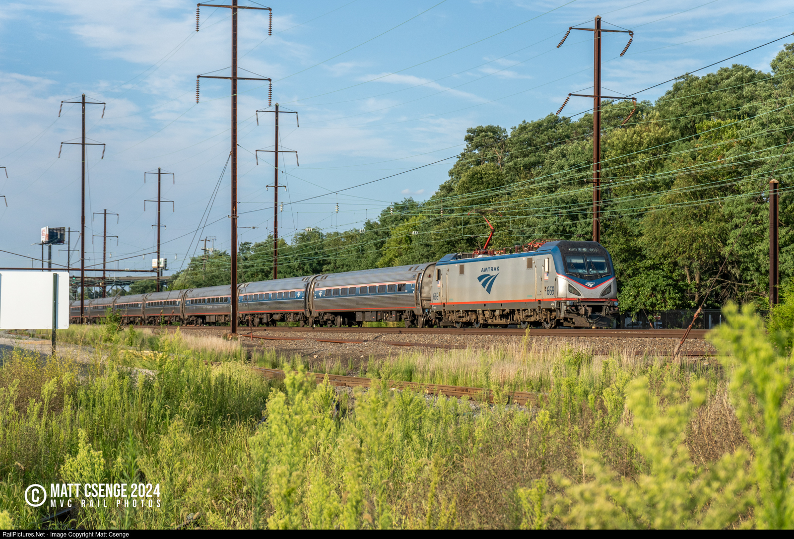 Amtrak ACS-64 no. 669 is seen leading Northeast Regional train 149 through Bristol, PA on a bright summer evening. |