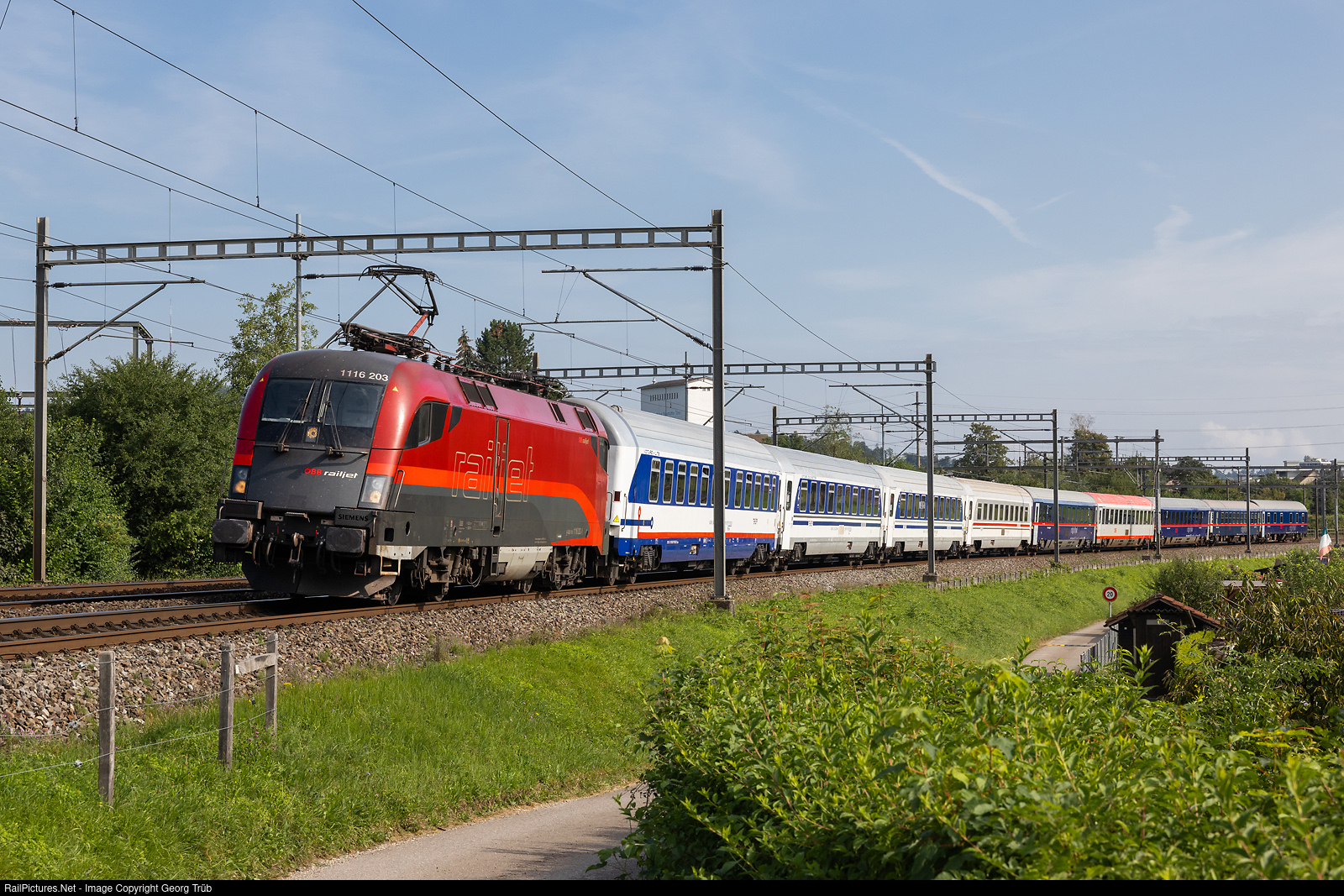 Due to a line closure between Feldkirch and Buchs SG for construction work from August 10 to September 8, 2024, various trains between Austria and Switzerland will be rerouted from Feldkirch via Wolfurt-St.Margrethen-Romanshorn VL-Winterthur to Zurich. As there is no hairpin bend, the train will be pulled to Zurich by an ÖBB locomotive. Siemens "Taurus" 1116 # 203 of the ÖBB pulls the Nightjet NJ464 from Graz via St.Margrethen-Romanshorn VL-Winterthur to Zürich, between Winterthur and Winterthur Tössmühle. Behind the locomotive are the bed, couchette and seat cars from Zagreb/Croatia, in the rear the austrian bed, couchette and seat cars from Graz.