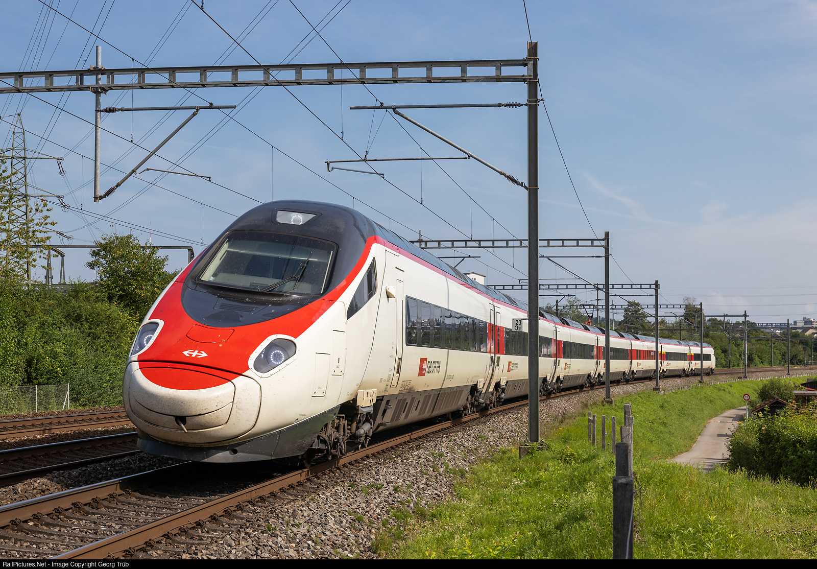 | Highspeed tilting train RABe 503 # 020 of the SBB is running the EC 198 from Munich to Zürich, between Winterthur and Winterthur Tössmühle. The trains is 10 minutes late but was not rerouted via the Thurtal line, but ran the schedulded route via St.Gallen. |