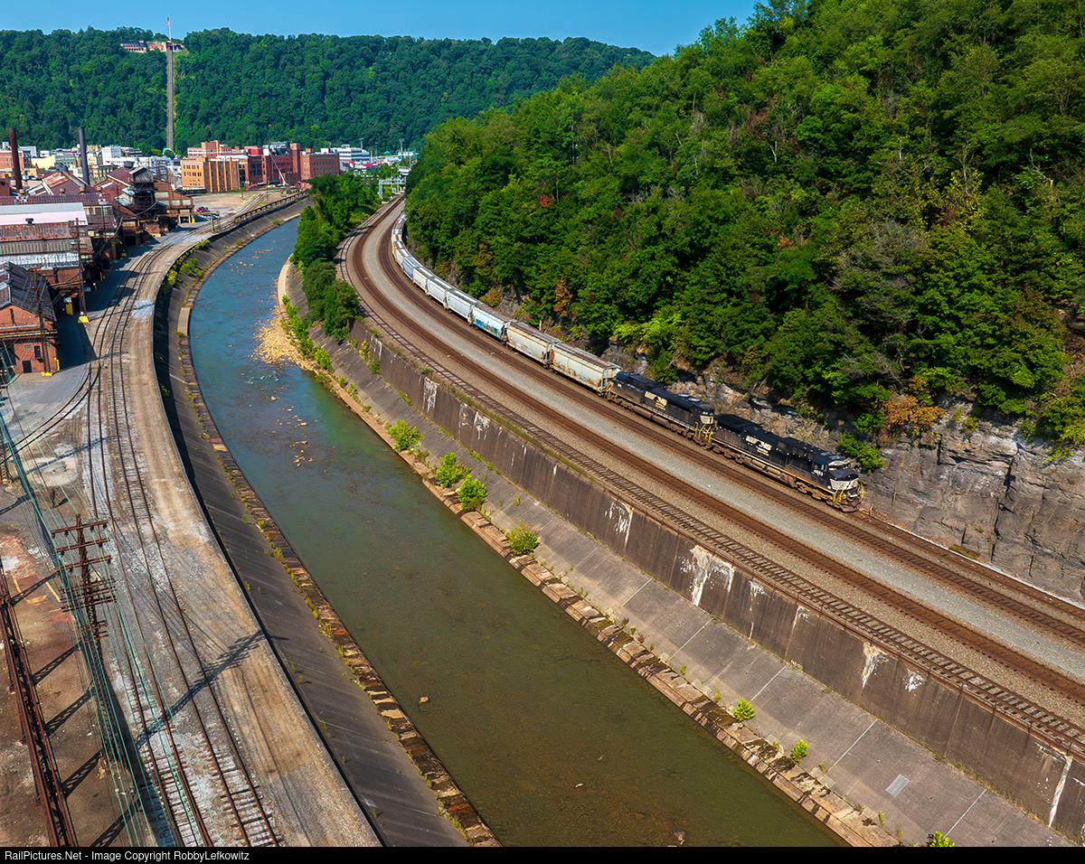 Conemaugh Corn: NS 4563 leads loaded grain train NS 44M eastbound through Johnstown, Pennsylvania, as they begin their climb up the mountain and toward Altoona.