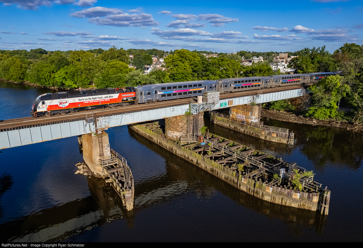 A Waldwick bound Mainline train crosses the Passaic River in Lyndhurst. ALP-45 4503 is currently wrapped in a special scheme celebrating Atlas Model Railroad Co.'s 100th anniversary.