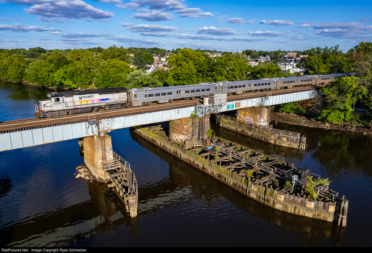| NJT 4205, one of two GP40PH-2s in passenger service to wear the speed stripe scheme, leads a Port Jervis express over the Passaic River. |
