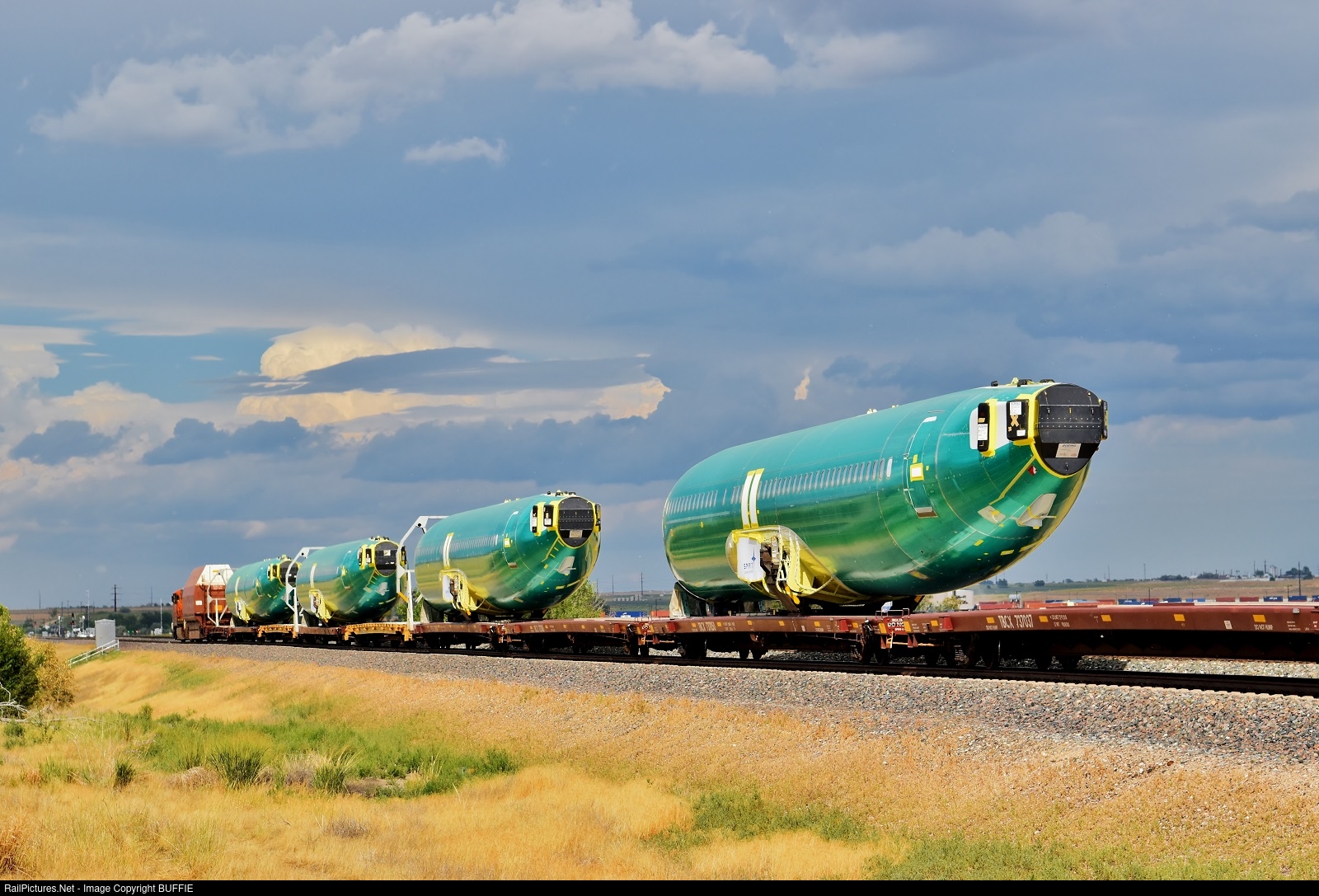 Four Boeing 737 fuselages fly in tight formation towards storm clouds through Hudson, Colorado as they head east on the Brush Sub.
