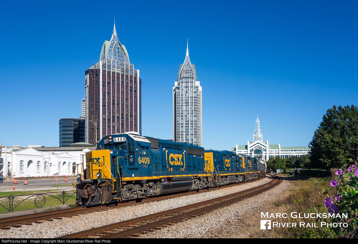 Scene To Change Soon. CSX M724-21 was on the way to Theodore, Alabama on the afternoon of Sunday, October 21, 2018 as it passed through the Mobile Convention Center in Mobile, Alabama with the power set of CSXT 6409 (née-C&O 6409, GP40-2), CSXT 2226 (Road Slug, ex-B&O 6909, GP-30), and CSXT 6508 (ex-CSX 6355, née-SCL 1645, GP40-3). The train is in front of the dormant former Amtrak passenger platform, but the area is undergoing significant change as the city prepares for the return of Amtrak service between Mobile, AL and New Orleans, LA. Until it was demolished after Hurricane Katrina in 2006, there was a station building here that had been built by the Louisville & Nashville in 1956 to serve the 'Humming Bird' and the "Pan-American', trains that would give way to the 'Gulf Breeze' and 'Gulf Coast Limited' and ultimately the 'Sunset Limited', which last served the city in August, 2005.