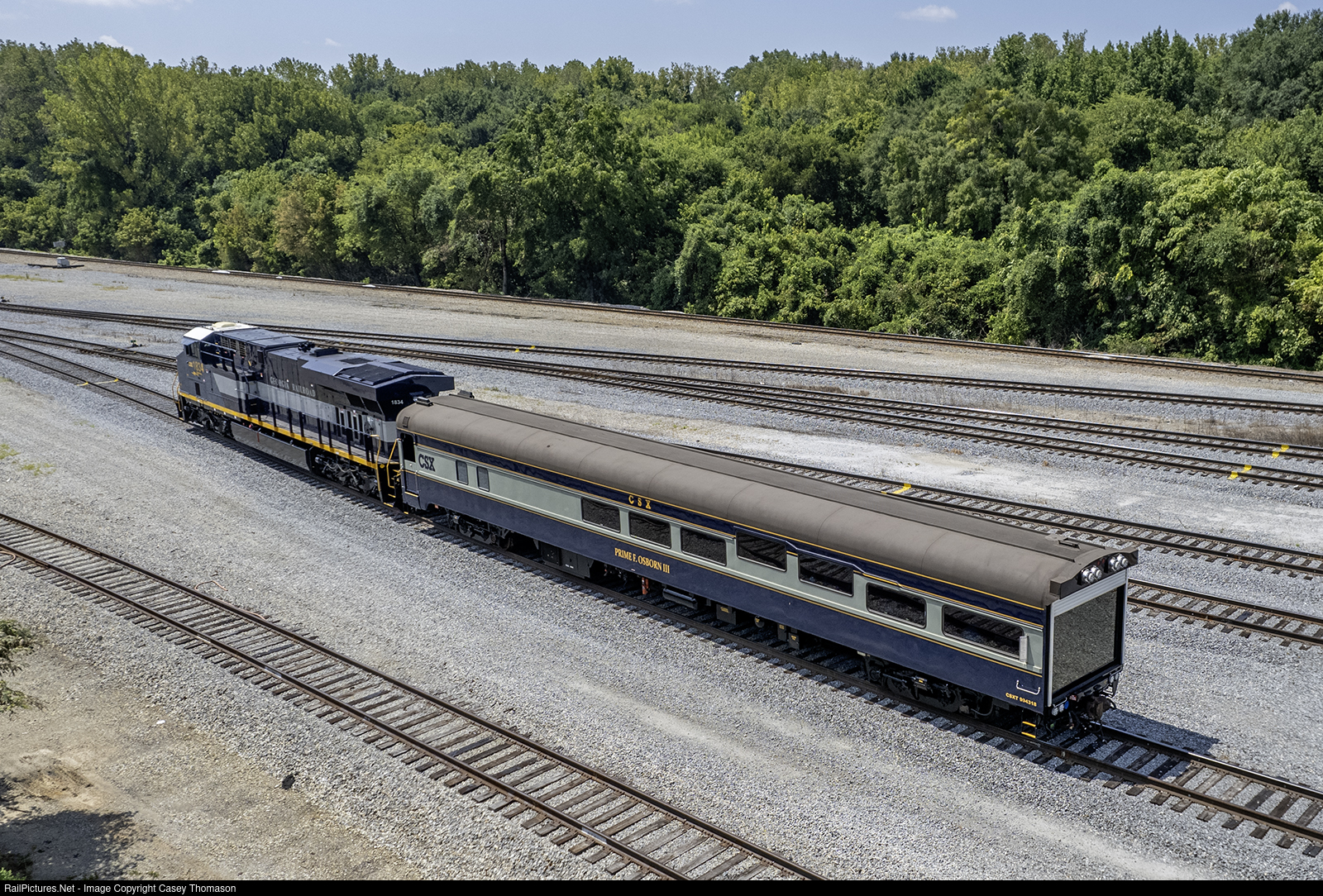 | CSX's "Georgia Road" heritage unit pulls the Prime Osborn business car during "Family Day" at Tilford Yard in Atlanta, Georgia. Being one of the two theatre cars in CSX's office car fleet, this one was rebuilt from Georgia Railroad coach #106. |