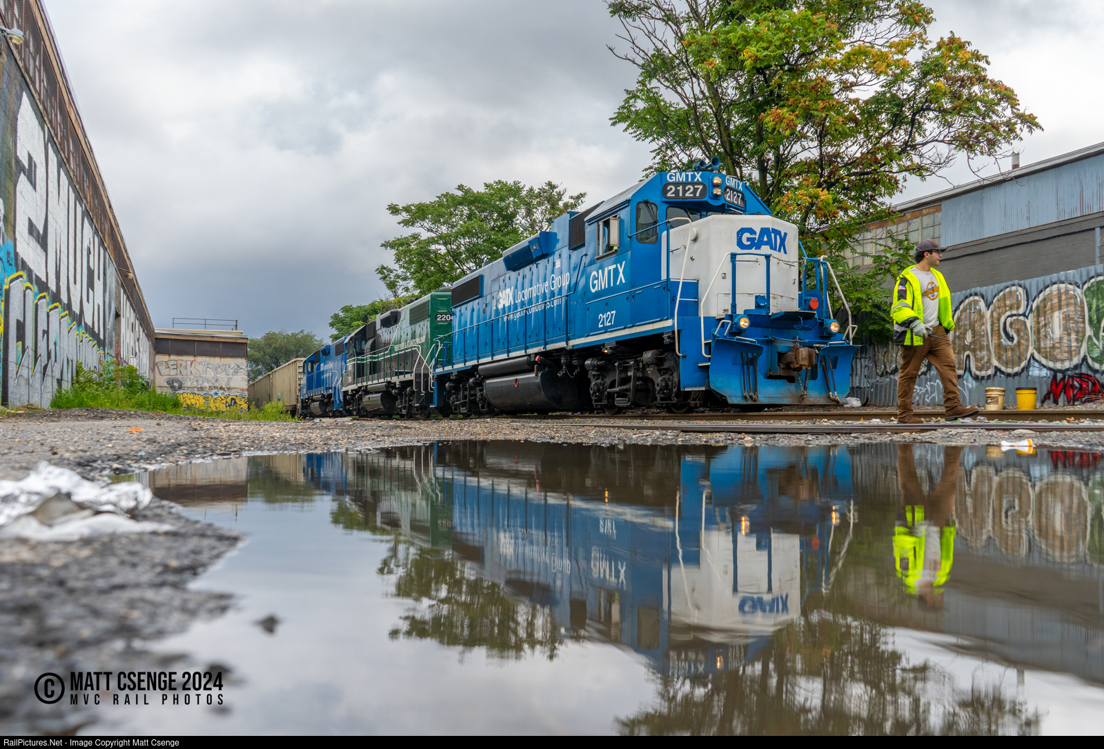 New York & Atlantic train RS40 pauses momentarily near Morgan Avenue while the conductor walks ahead to flag the crossing. The locomotive consist for the day was three leased GP38-2s: GMTX 2127, 2204, and 2200. |