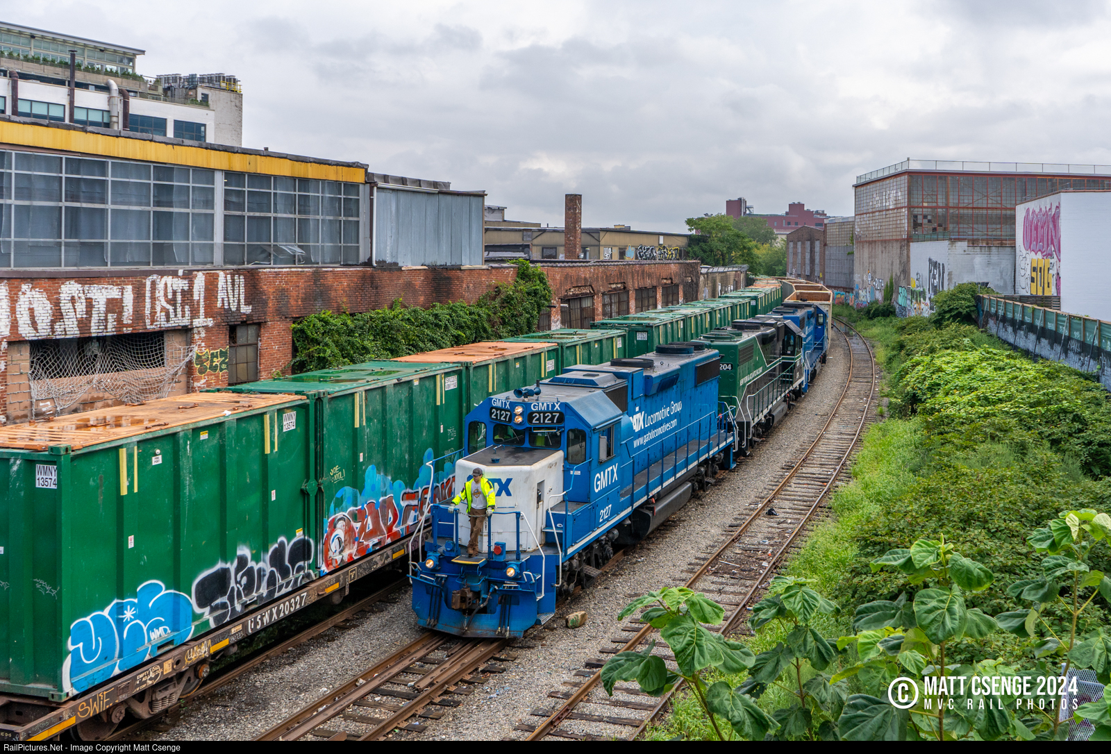 New York & Atlantic train RS40 is seen crawling down the Bushwick Branch on a gray Sunday morning, seen here from the pedestrian bridge at Scott Avenue. |