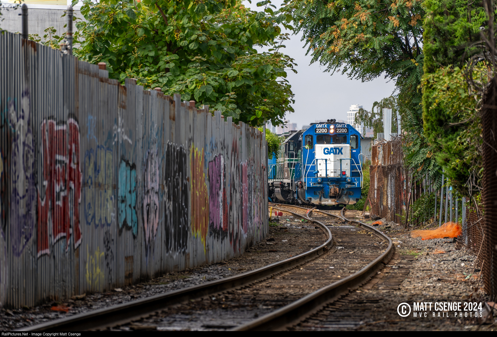 Urban Jungle. New York & Atlantic train RS40 is seen near 54th St in Maspeth, Queens, working industries on the Bushwick Branch. Leased GP38-2 locomotive GMTX 2200 was on the east end of the train on this day.