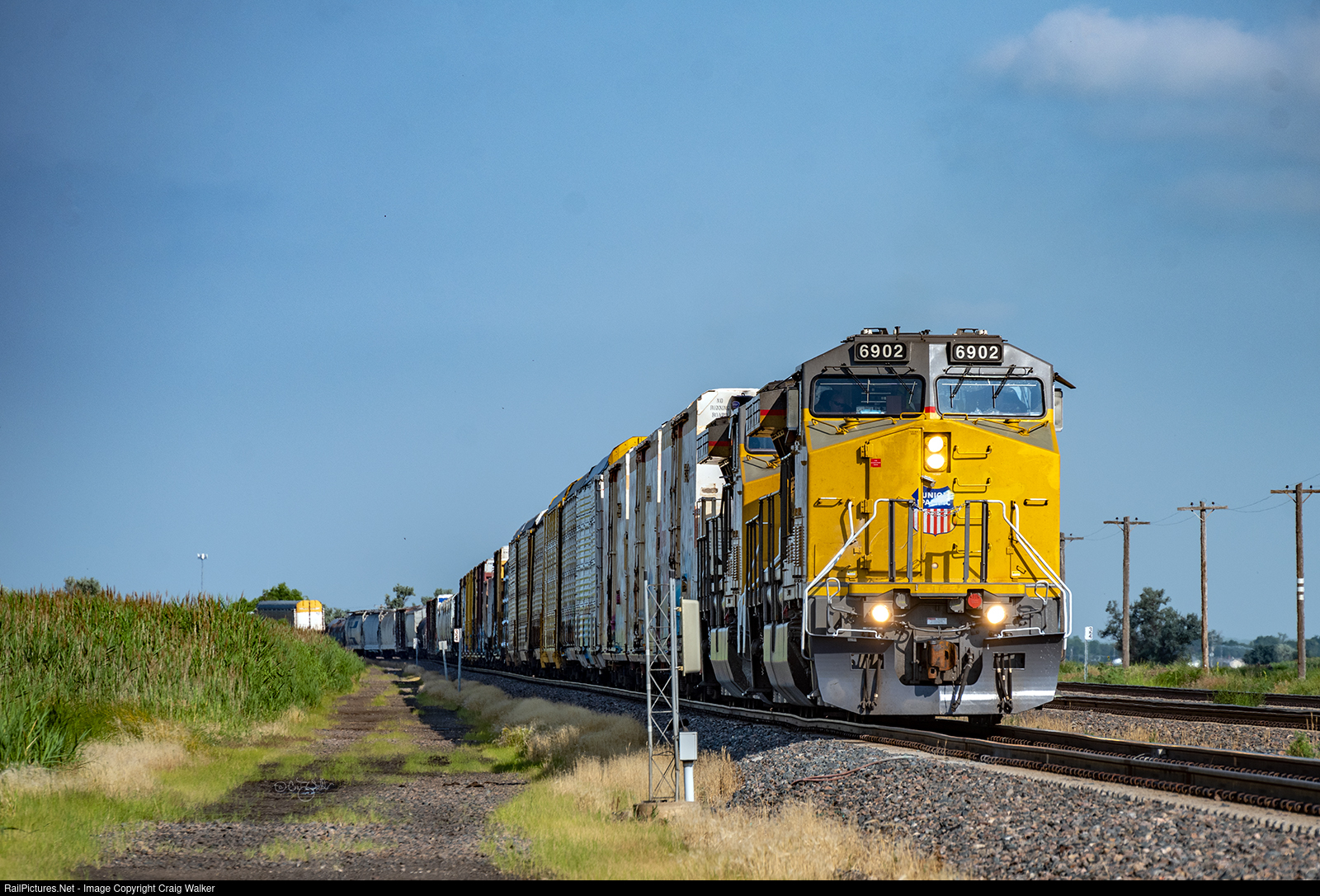 This train is led by a pair of UP's C4400CWM/C44ACM/AC6000CW/AC6044AC locomotives (feel free to select whichever of these you prefer!). UP 6902 and 6909 are both painted in the latest iteration of UP's long-running Armour Yellow and Harbor Mist Grey paint scheme – the version in which the incredibly attractive winged shield on the nose has been eliminated (in favor of the bland UP shield without the wings), and the large American Flag Scotchlite™ decal on the long hood (which was subject to burning when a locomotive's prime mover would overheat) has been reduced in size and relocated to the side of the locomotive's nose, making that part of the locomotive look cluttered. Buried near the middle of the train is the Distributed Power Unit (DPU), CSX Transportation ET44AC 3429 (wearing CSXT's "YN3" scheme).