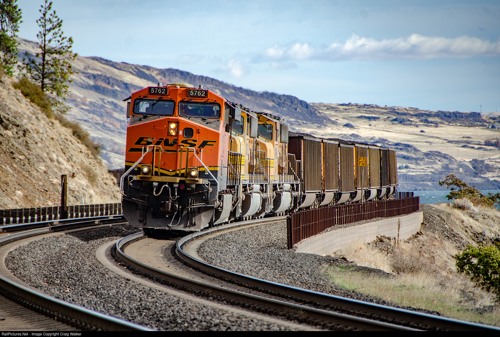 Sitting in the siding at Lyle, Washington, is BNSF Railway coal train BNSF train C-SXMRBG3-53 (Signal Peak MT to Robert Banks [Global] BC). An eastbound has just passed, and ES44AC 5762 and SD70MACs 8803 and 9899 (along with ES44C4 6166 on the rear) are about to begin moving their train westward along the Fallbridge Sub once again. This is the former Spokane Portland & Seattle mainline built along the northern bank of the Columbia River – a water-level route with gentle grades but a lot of tunnels and curves as it follows this impressive river through the spectacular scenery of the Columbia River Gorge. (Lyle, Washington – October 25, 2019)