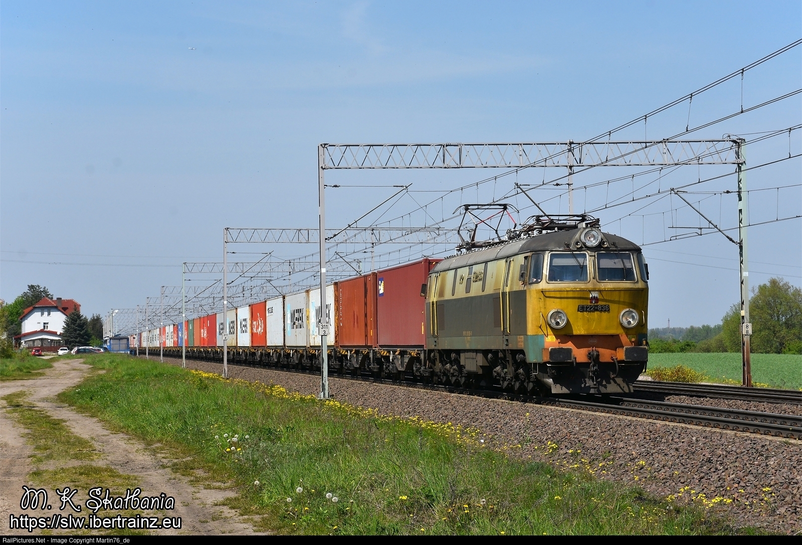 | The electric locomotive ET22-836 hauling a freight container train from Gdansk GPA to Slawków. |